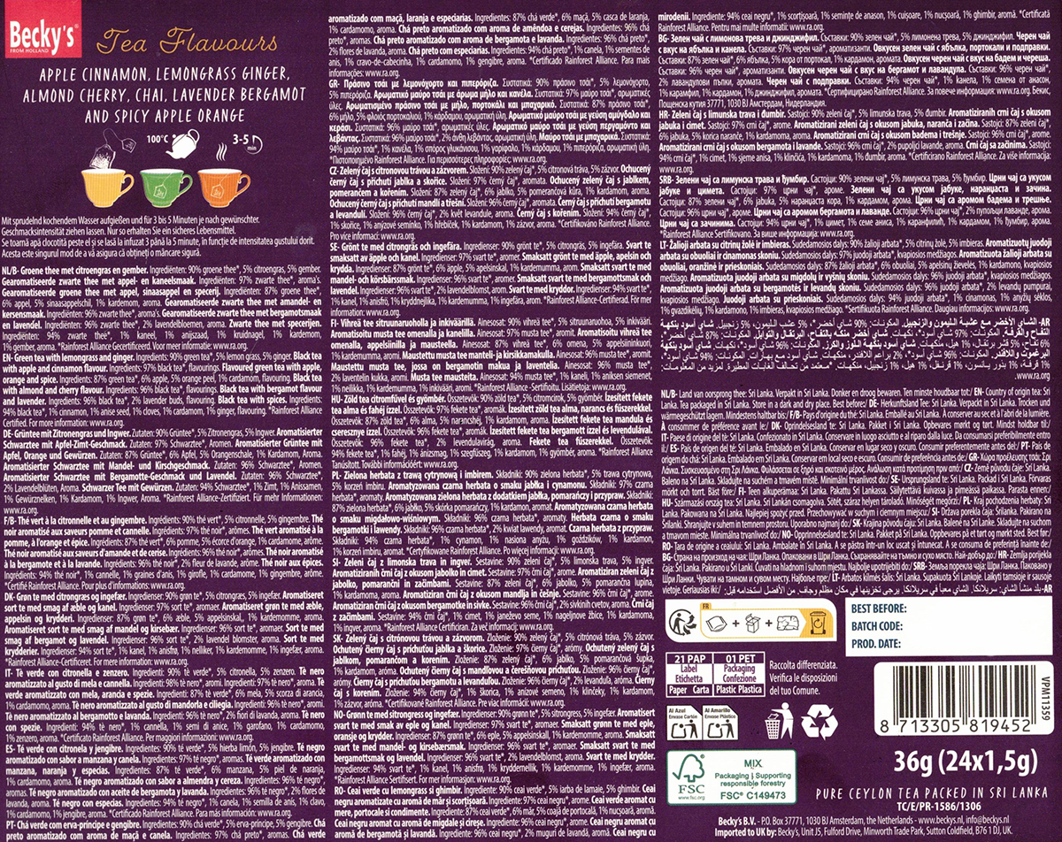 Tè verde, citronella, zenzero, tè nero, aromi, mela, scorza di arancia, cardamomo, fiori di lavanda, cannella, semi di anice, garofano.