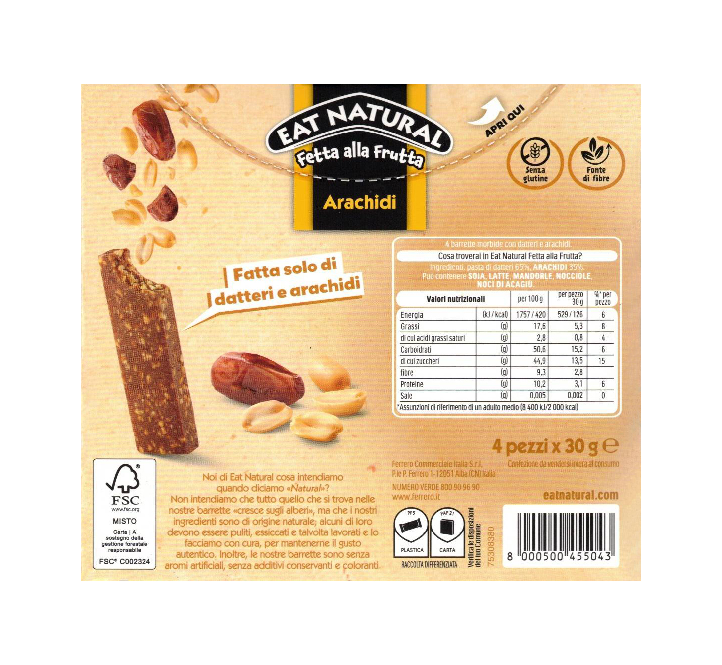 Ingredienti: pasta di datteri 65%, arachidi 35%. Può contenere soia, latte, mandorle, nocciole e noci di acagiù.