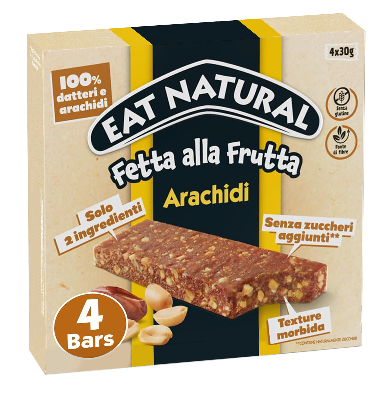 Cosa intende Eat Natural quando dice Natural? Non intende che tutto quello che si trova nelle barrette cresce sugli alberi, ma che gli ingredienti sono di origine naturale; alcuni di loro devono essere puliti, essiccati e talvolta lavorati e lo facciamo con cura, per mantenerne il gusto autentico. Inoltre, le nostre barrette sono senza aromi artificiali, senza additivi conservanti e coloranti. Questa fantastica fetta alla frutta prevede solo 2 ingredienti: datteri e arachidi.