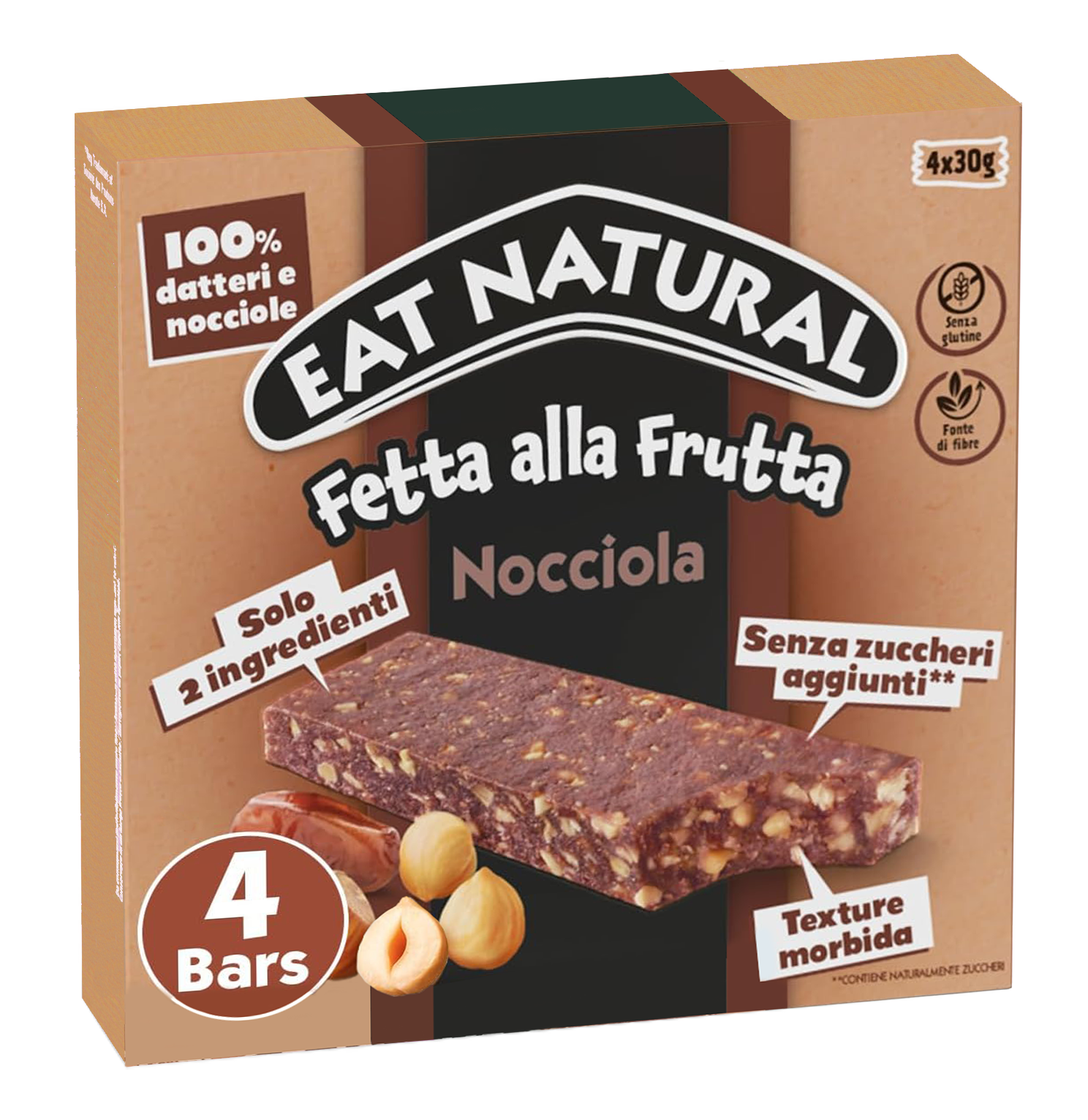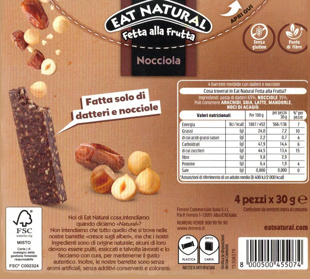 Cosa intende Eat Natural quando dice Natural? Non intende che tutto quello che si trova nelle barrette cresce sugli alberi, ma che gli ingredienti sono di origine naturale; alcuni di loro devono essere puliti, essiccati e talvolta lavorati e lo facciamo con cura, per mantenerne il gusto autentico. Inoltre, le nostre barrette sono senza aromi artificiali, senza additivi conservanti e coloranti. Questa fantastica fetta alla frutta contengono solo due ingredienti: datteri e nocciole.