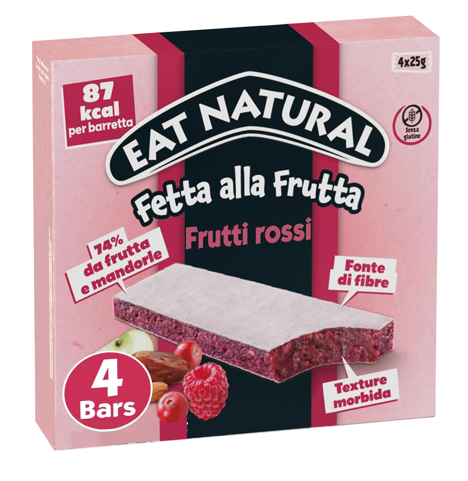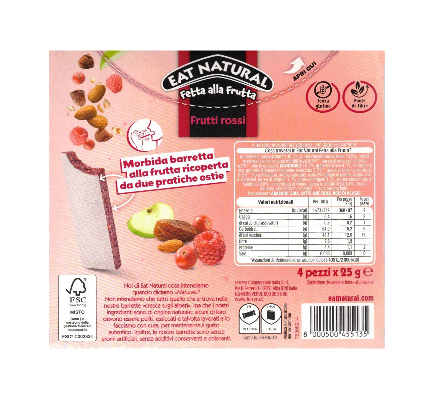 Cosa intende Eat Natural quando dice Natural? Non intende che tutto quello che si trova nelle barrette cresce sugli alberi, ma che gli ingredienti sono di origine naturale; alcuni di loro devono essere puliti, essiccati e talvolta lavorati e lo facciamo con cura, per mantenerne il gusto autentico. Inoltre, le nostre barrette sono senza aromi artificiali, senza additivi conservanti e coloranti. Questa fantastica fetta alla frutta morbida è ricoperta da 2 pratiche ostie ed è fatta con frutti rossi, mandorle, datteri e mela.