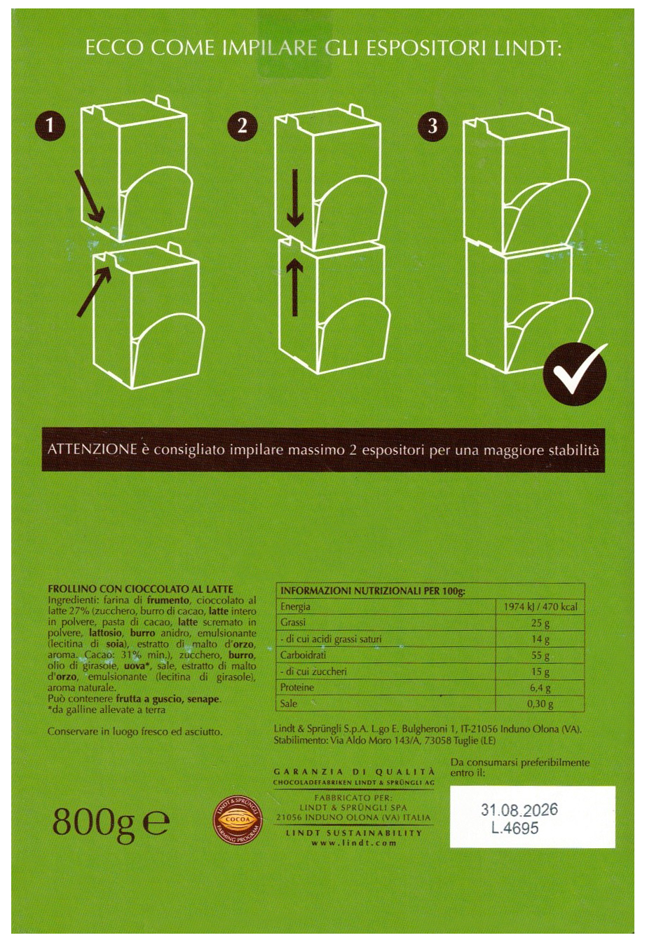 Farina di frumento, cioccolato al latte 27% (zucchero, burro di cacao, latte intero in polvere, pasta di cacao, latte scremato in polvere, lattosio, burro anidro, emulsionante (lecitina di soia), estratto di malto d’orzo, aroma. Cacao: 31% min.), zucchero, burro, olio di girasole, uova, sale, estratto di malto d’orzo, emulsionante (lecitina di girasole), aroma naturale. Può contenere frutta a guscio, senape.