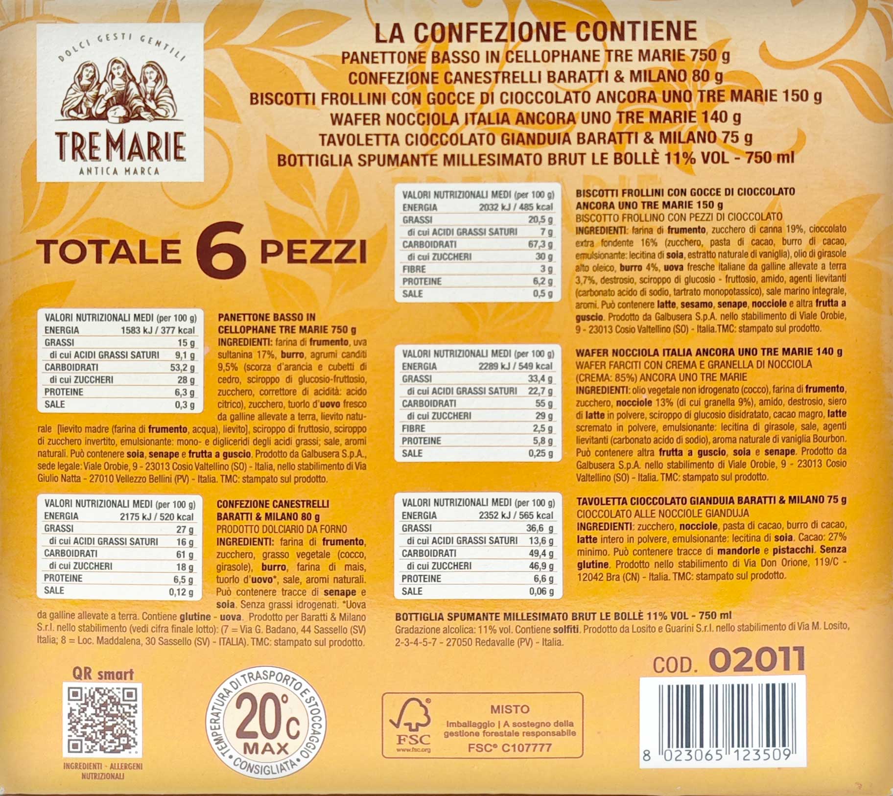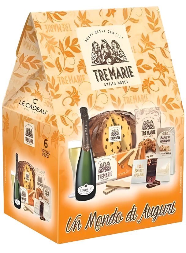 Scopri l’elegante confezione regalo ‘Un Mondo di Auguri’ di Tre Marie, un’esclusiva selezione di 6 prelibatezze italiane che incarnano la tradizione dolciaria. Questo raffinato assortimento include un Panettone basso da 750g in cellophane, deliziosi Biscotti Frollini con gocce di cioccolato da 150g, croccanti Canestrelli da 80g, squisiti Wafer alla nocciola da 140g, una pregiata Tavoletta di cioccolato gianduia da 75g e una bottiglia di spumante millesimato brut Le Bolle 11% vol da 750ml. Ogni componente è stato accuratamente selezionato per offrire un’esperienza gustativa indimenticabile. La confezione, elegantemente decorata con motivi floreali e il caratteristico logo Tre Marie, è perfetta come regalo per occasioni speciali o per celebrare momenti importanti. Un dono che unisce l’eccellenza della pasticceria italiana alla raffinatezza della presentazione, ideale per condividere momenti di gioia e convivialità.
