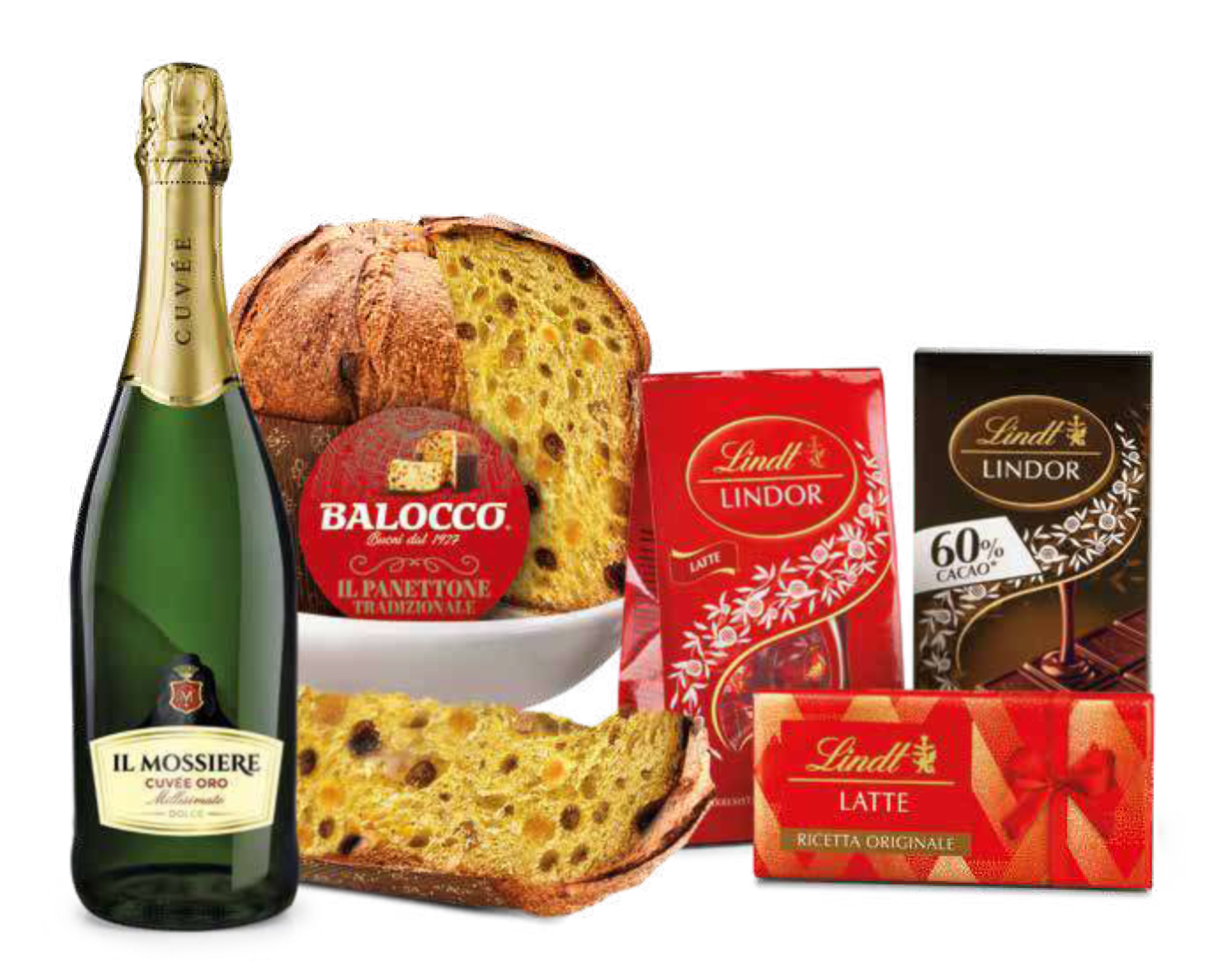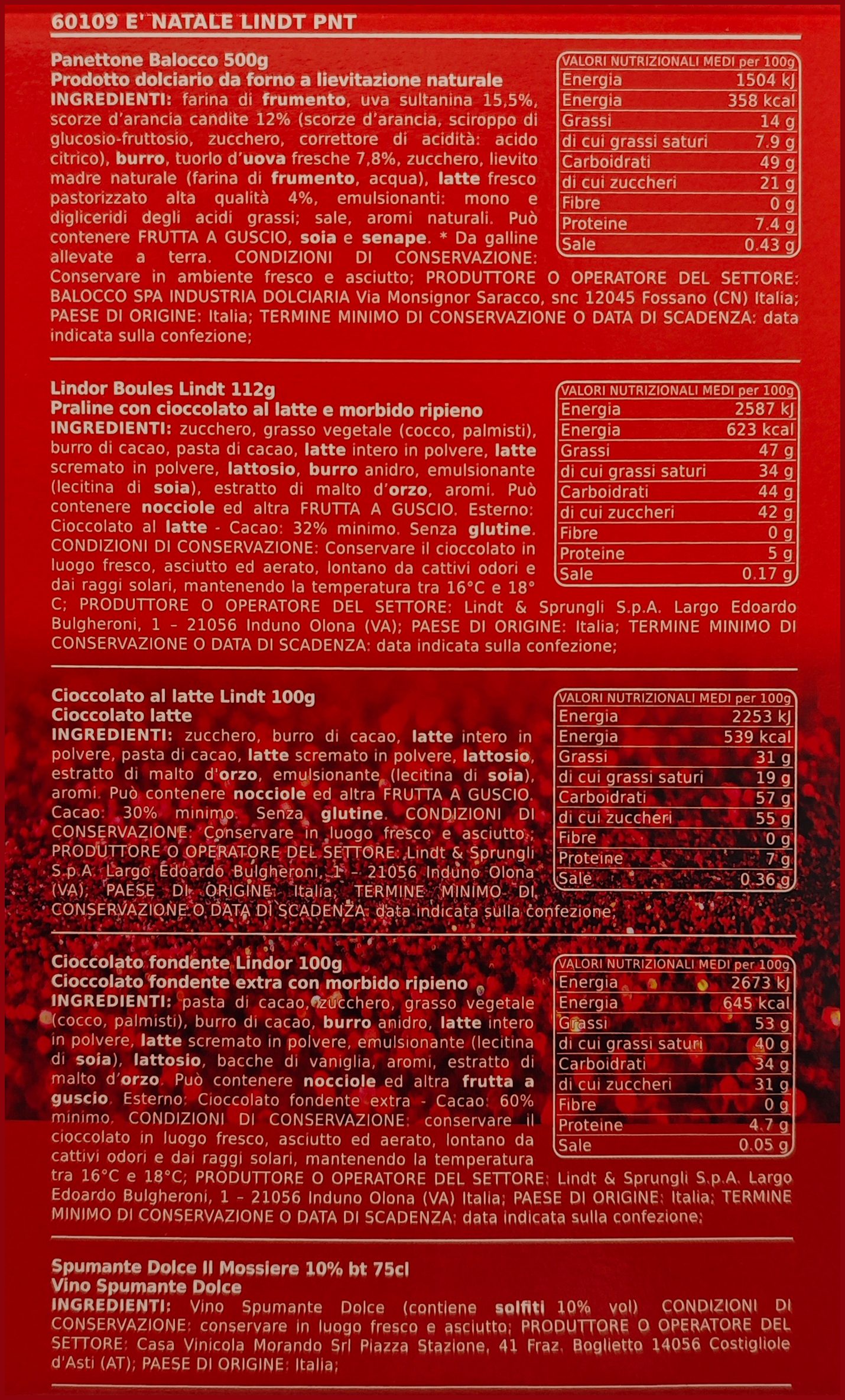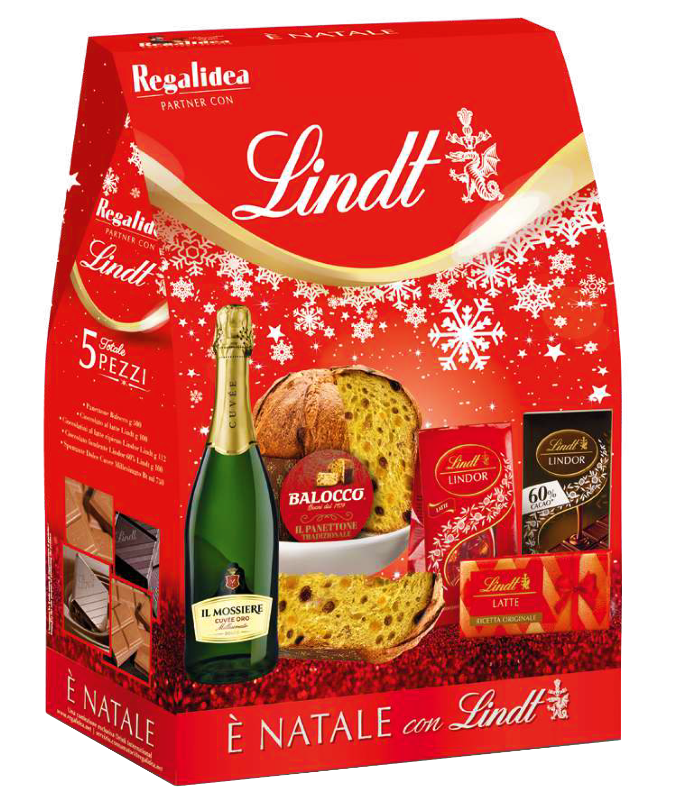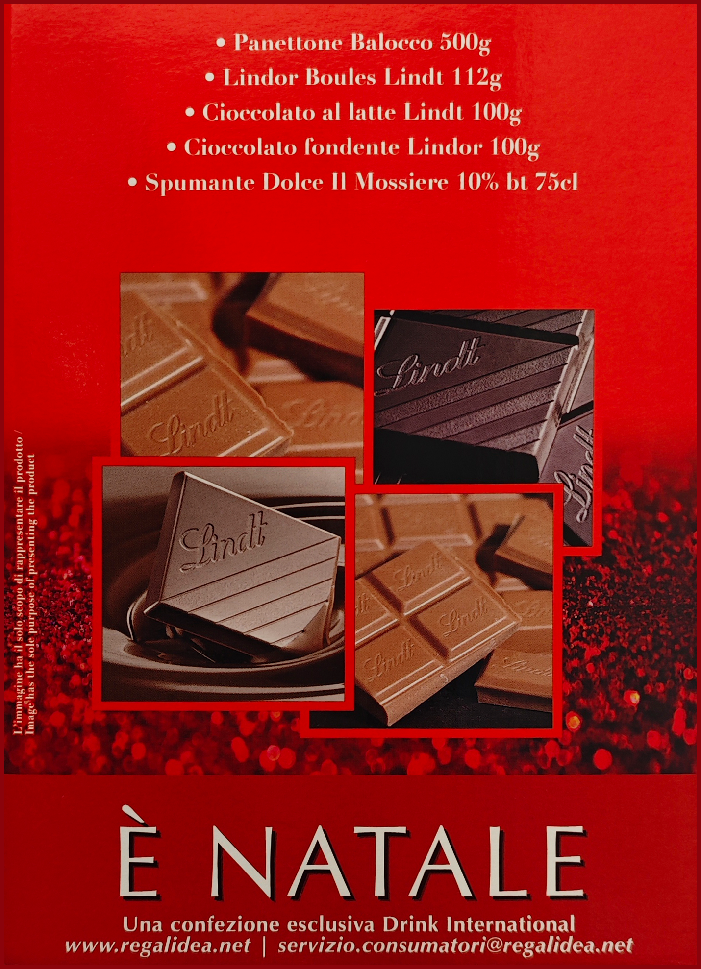 La confezione regalo contiene ben 5 pezzi delle prelibatezze della nostra Italia come il più amato Panettone, deliziosi cioccolatini, tavoletta di cioccolato al Latte e Fondente e una bottiglia di spumante.