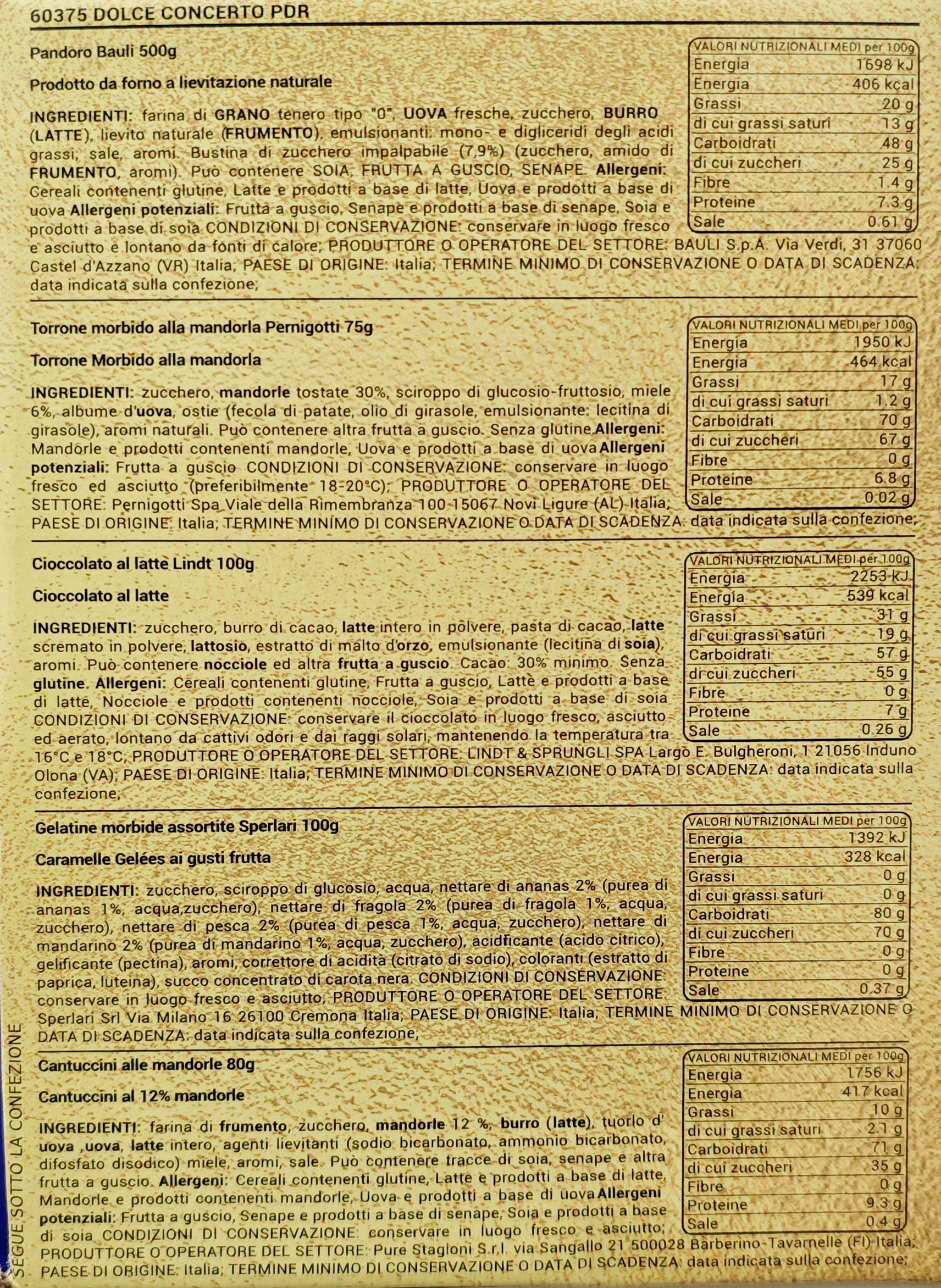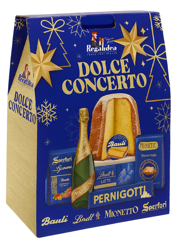 Celebra le festività con stile grazie al magnifico set regalo Dolce Concerto! Questa elegante confezione blu notte decorata con stelle dorate contiene sei deliziose specialità italiane: un soffice Pandoro tradizionale, gustose gelatine e caramelle assortite, una prelibata tavoletta di cioccolato, croccanti cantuccini toscani, un irresistibile torrone e una bottiglia per brindare alle feste.