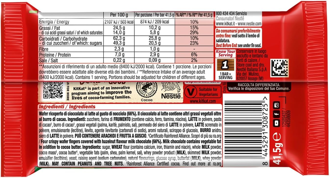 Scopri il delizioso Kit Kat al gusto di nocciola, un’esperienza di gusto che unisce la croccantezza del wafer con la cremosità del cioccolato al latte e il sapore avvolgente delle nocciole. Ogni barretta è un piccolo capolavoro, perfetta per una pausa dolce durante la giornata o come snack da condividere con amici e familiari. Confezionato in una pratica scatola da 24 pezzi da 41,5 g, questo Kit Kat è ideale per chi ama concedersi un momento di piacere senza rinunciare alla qualità. Lasciati conquistare dalla combinazione unica di sapori e dalla consistenza irresistibile di questo snack, perfetto per ogni occasione!
