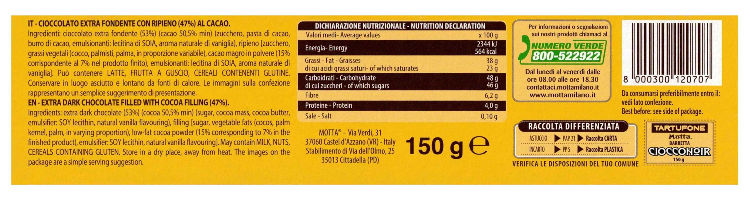 Cioccolato extra fondente (cacao 50,5% min) (zucchero, pasta di cacao, burro di cacao, emulsionanti: lecitina di soia, aroma naturale di vaniglia). Ripieno 47% [zucchero, grassi vegetali (cocco, palmisti, palma, in proporzione variabile), cacao magro in polvere (15%), cereali (farina di frumento, farina di riso, zucchero, cacao magro in polvere, farina di malto di frumento, farina di avena, malto di frumento, destrosio, sale, aroma naturale di vaniglia), emulsionanti: lecitina di soia, aroma naturale di vaniglia]. Può contenere latte, frutta a guscio