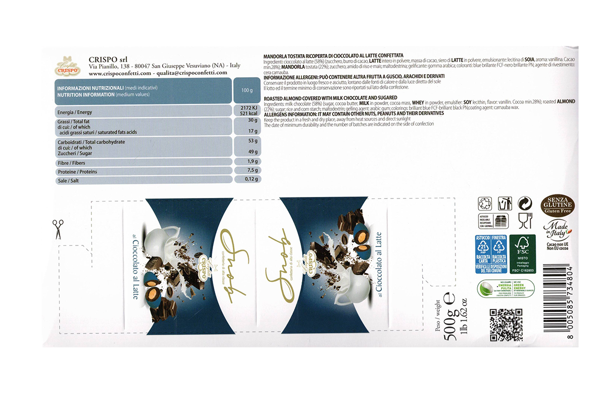 Scopri il piacere unico dei Confetti Color Blu Galaxy di Crispo Snob, una prelibatezza di alta classe che unisce il delizioso cioccolato al latte con croccanti nocciole. Ogni confezione da 500g è perfetta per chi cerca un dolce senza glutine, ideale per ogni occasione, dalle celebrazioni ai momenti di relax. Lasciati conquistare dalla loro eleganza e dal gusto inconfondibile, un regalo perfetto per gli amanti del cioccolato e della qualità. Non perdere l’opportunità di assaporare questa raffinata esperienza di gusto.