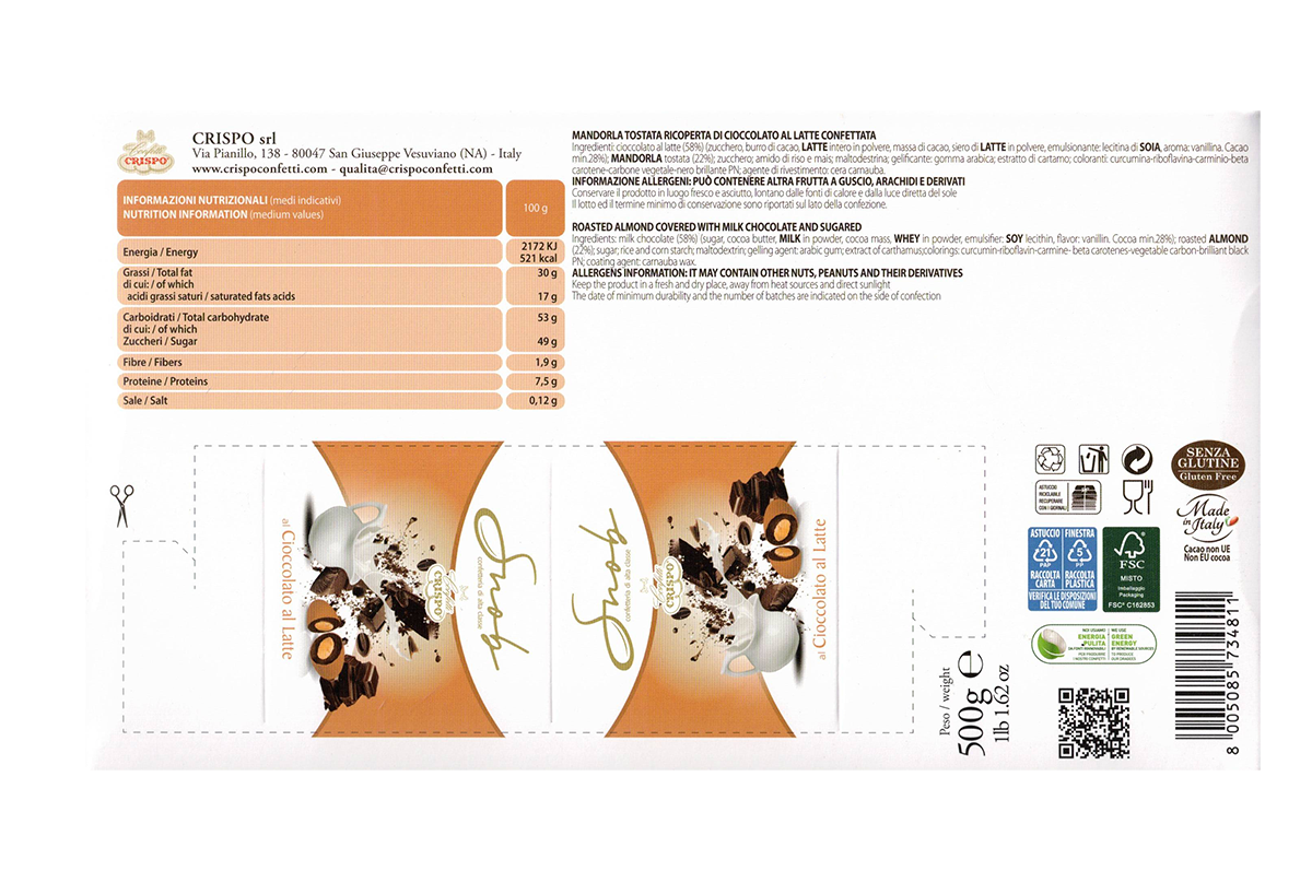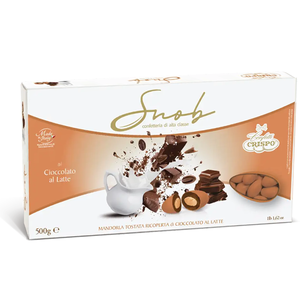 I Crispo Snob Confetti rappresentano l’eccellenza della confetteria italiana di alta classe. Questi raffinati confetti color mocha mousse racchiudono un cuore di cremoso cioccolato al latte, avvolto in un elegante guscio croccante che li rende irresistibili al palato. La confezione da 500g è perfetta per eventi speciali, cerimonie eleganti, matrimoni e bomboniere raffinate!