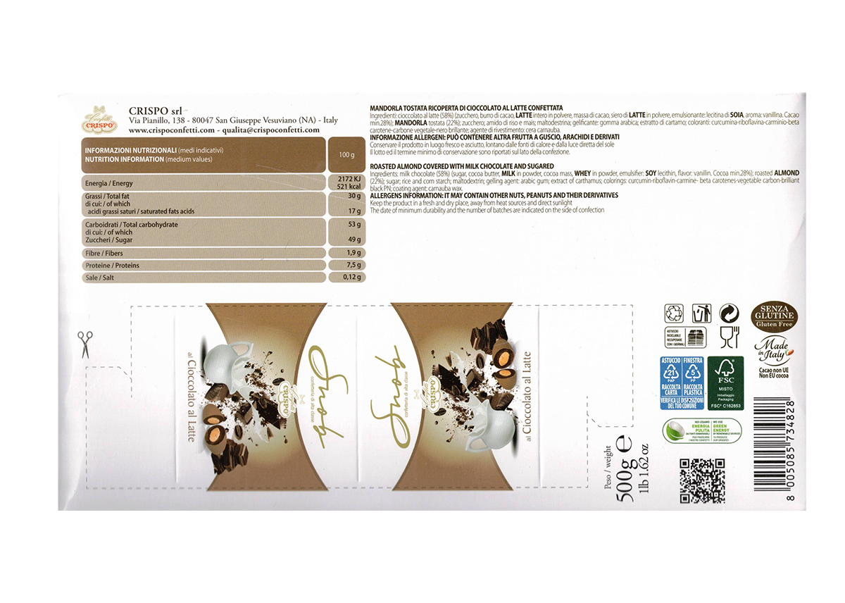 I Crispo Snob Confetti rappresentano l’eccellenza della confetteria italiana di alta classe. Questi raffinati confetti color terracotta racchiudono un cuore di cremoso cioccolato al latte, avvolto in un elegante guscio croccante che li rende irresistibili al palato. La confezione da 500g è perfetta per eventi speciali, cerimonie eleganti, matrimoni e bomboniere raffinate. Realizzati senza glutine, questi confetti sono adatti anche a chi ha esigenze alimentari particolari, senza rinunciare al gusto autentico e alla qualità superiore. Il colore terracotta conferisce un tocco di sofisticazione ed eleganza, ideale per decorare tavole importanti o per creare composizioni scenografiche. Prodotti in Italia da Crispo, azienda rinomata per la sua tradizione nella confetteria artigianale, questi confetti uniscono sapore delicato e presentazione impeccabile. Ogni confetto è una piccola opera d’arte che celebra i momenti più importanti della vita con stile e raffinatezza.