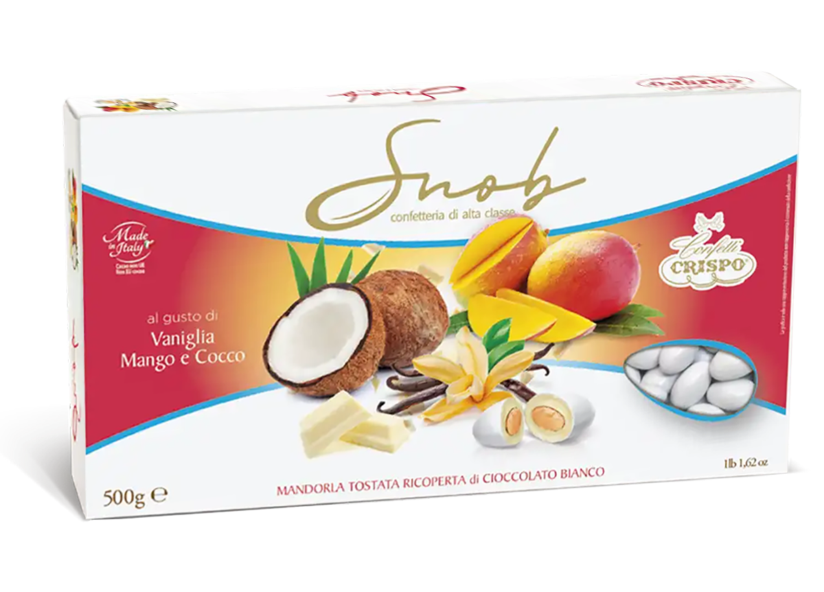 I Crispo Snob Confetti rappresentano l’eccellenza della confetteria italiana di alta classe. Questi raffinati confetti sono realizzati con mandorle tostate di qualità superiore, avvolte in un delicato cioccolato bianco e confettate con un’irresistibile combinazione di gusti esotici: vaniglia, mango e cocco!