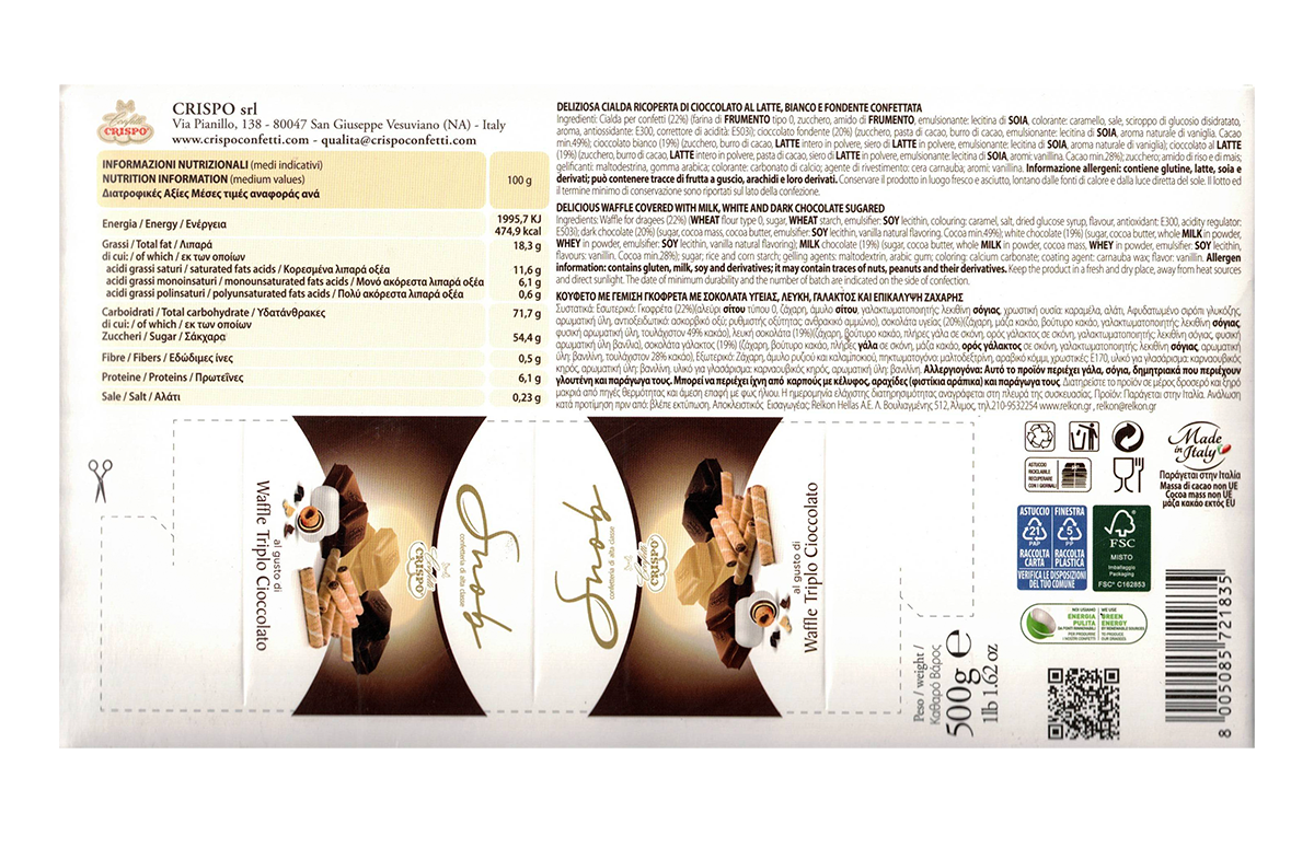 Scopri il piacere irresistibile dei Crispo Snob Confetteria di Classe Waffle Triplo Cioccolato. Questa deliziosa cialda è ricoperta da un triplo strato di cioccolato al latte, bianco e fondente, arricchita con croccanti nocciole. Ogni morso offre un’esperienza di gusto unica, perfetta per soddisfare le tue voglie di dolcezza. Confezionati in una pratica busta da 500g, questi snack sono ideali per una pausa golosa o per condividere momenti speciali con amici e familiari. Non perdere l’occasione di assaporare questa prelibatezza!