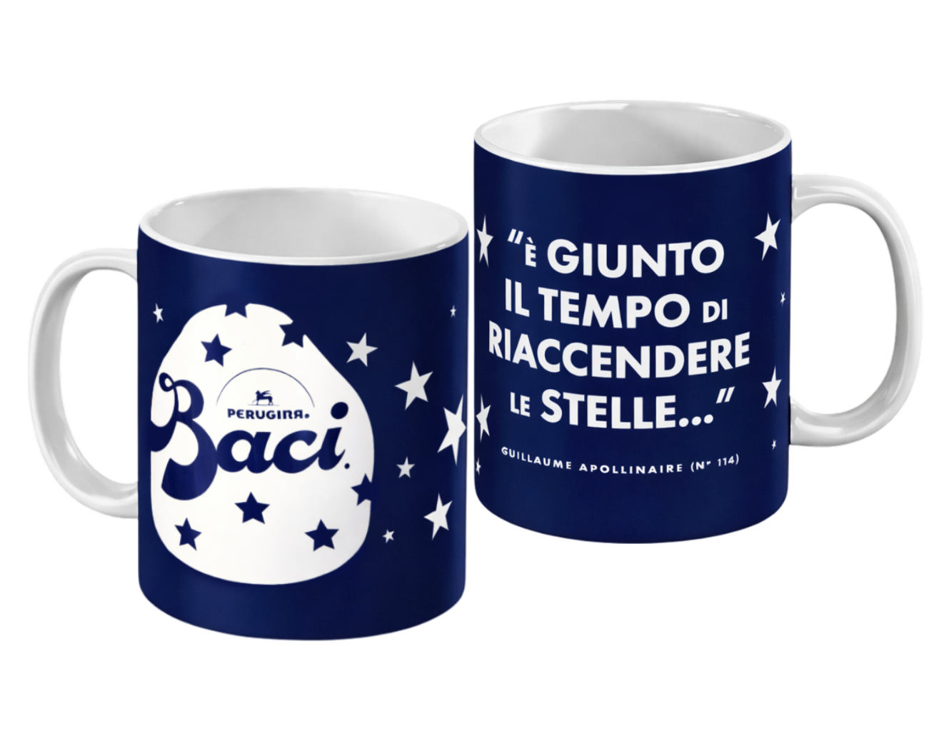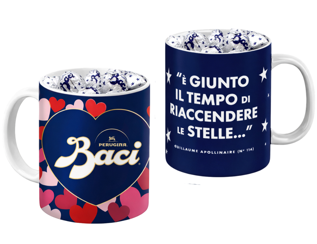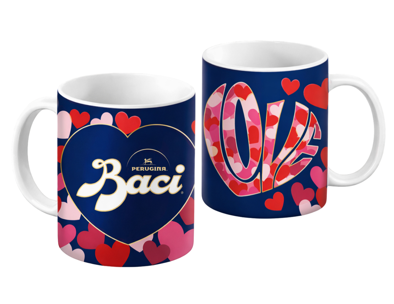 Tazza in ceramica Perugina Baci® dal design iconico ed elegante, perfetta per la colazione, una pausa caffè o come idea regalo romantica. La tazza è ispirata allo stile inconfondibile dei Baci Perugina, con 2 grafiche differenti: una decorata con cuori e logo Baci, l’altra con stelle e una celebre frase d’amore. All’interno è presente una confezione di Baci Perugina per rendere il regalo ancora più speciale. Ideale per San Valentino, anniversari o per gli amanti del cioccolato.