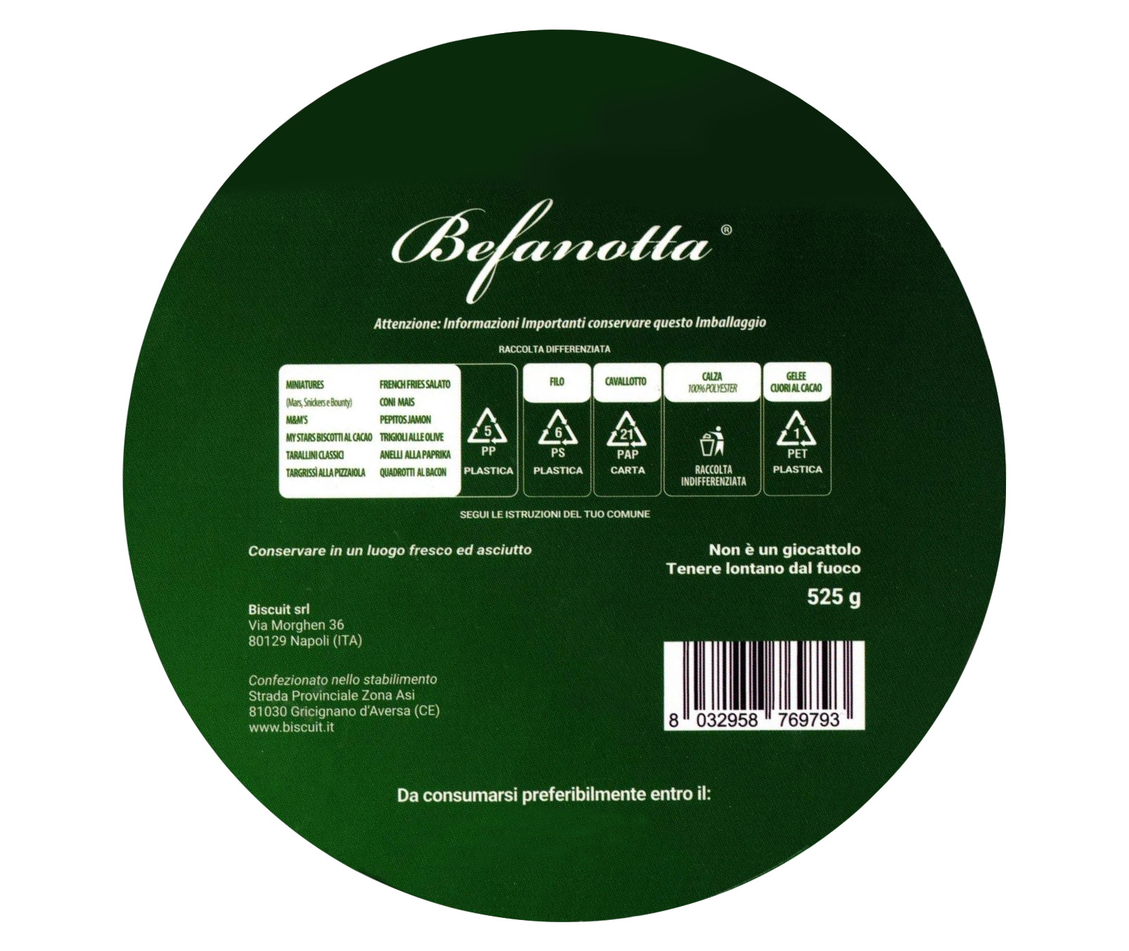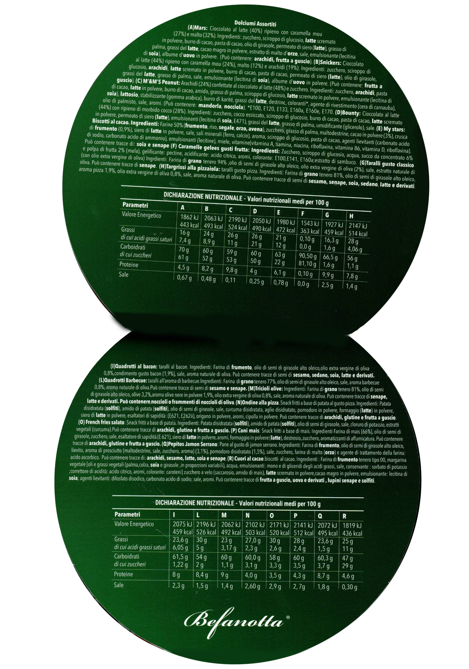 Ingredienti: (A)Mars: Cioccolato al latte (40%) ripieno con caramella mou (27%) e malto (32%). Ingredienti: zucchero, sciroppo di glucosio, latte scremato in polvere, burro di cacao, pasta di cacao, olio di girasole, permeato di siero (latte), grasso di palma, grassi del latte, cacao magro in polvere, estratto di malto d’orzo, sale, emulsionante (lecitina di soia), albume d’uovo in polvere. (Può contenere: arachidi, frutta a guscio). (B)Snickers: Cioccolato al latte (44%) ripieno con caramella mou (24%), malto (12%) e arachidi (19%). Ingredienti: zucchero, sciroppo di glucosio, arachidi, latte scremato in polvere, burro di cacao, pasta di cacao, permeato di siero (latte), olio di girasole, grassi del latte, grasso di palma, sale, emulsionante (lecitina di soia), albume d’uovo in polvere. (Può contenere: frutta a guscio). (C) M&M’S Peanut: Arachidi (24%) confettate al cioccolato al latte (48%) e zucchero. Ingredienti: zucchero, arachidi, pasta di cacao, latte in polvere, burro di cacao, amido, grasso di palma, sciroppo di glucosio, latte scremato in polvere, emulsionante (lecitina di soia), lattosio, stabilizzante (gomma arabica), burro di karité, grassi del latte, destrine, coloranti*, agente di rivestimento (cera di carnauba), olio di palmisto, sale, aromi. (Può contenere: mandorla, nocciola). *E100, E120, E133, E160a, E160e, E170. (D)Bounty: Cioccolato al latte (44%) con ripieno di morbido cocco (28%). Ingredienti: zucchero, cocco essiccato, sciroppo di glucosio, burro di cacao, pasta di cacao, latte scremato in polvere, permeato di siero (latte), emulsionanti (lecitina di soia, E471), grassi del latte, grasso di palma, umidificante (glicerolo), sale. (E) My stars: Biscotti al cacao. Ingredienti: Farine 50% (frumento, riso, segale, orzo, avena), zucchero, grasso di palma, maltodestrine, cacao in polvere (3%), crusca di frumento (0,9%), siero di latte in polvere, sale, sali minerali (ferro, calcio), aroma, sciroppo di glucosio, pasta di cacao, agenti lievitanti (carbonato acido di sodio, carbonato acido di ammonio), emulsionanti (lecitine), miele, vitamine(vitamina A, tiamina, niacina, riboflavina, vitamina B6, vitamina D, riboflavina). Può contenere tracce di: soia e senape (F) Caramelle gelees gusti frutta: Ingredienti: Zucchero, sciroppo di glucosio, acqua, succo da concentrato 6% e polpa di frutta 2% (mela), gelificante: pectine, acidificante: acido citrico, aromi, colorante: E100,E141, E160a;estratto di sambuco. (G)Taralli gusto classico (con olio extra vergine di oliva) Ingrdienti: Farina di grano tenero 94%,olio di semi di girasole alto oleico, olio extra vergine di oliva (2%), sale, estratto naturale di oliva. Può contenere tracce di senape. (H)Targrissi alla pizzaiola: taralli gusto pizza. Ingredienti: Farina di grano tenero 81%, olio di semi di girasole alto oleico, aroma pizza 1,9%, olio extra vergine di oliva 0,8%, sale, aroma naturale di oliva. Può contenere tracce di semi di sesamo, senape, soia, sedano, latte e derivati. Quadrotti al bacon: taralli al bacon. Ingredienti: Farina di frumento, olio di semi di girasole alto oleico, olio extra vergine di oliva 0,8%, condimento gusto bacon (1,9%), sale, aroma naturale di oliva. Può contenere tracce di semi di sesamo, sedano, soia, latte e derivati. (L)Quadrotti Barbecue: taralli all’aroma di barbecue.Ingredienti: Farina di grano tenero 77%, olio di semi di girasole alto oleico, sale, aroma barbecue 0,8%, aroma naturale di oliva Può contenere tracce di semi di sesamo e senape. (M)Tricioli olive: Ingredienti: Farina di grano tenero 81%, olio di semi di girasole alto oleico, olive 3,2%, aroma olive nere in polvere 1,9%, olio extra vergine di oliva 0,8%, sale, aroma naturale di oliva. Può contenere tracce di senape, latte e derivati. Può contenere noccioli o frammenti di noccioli di oliva. (N)Ondine alla pizza. Snack fritti a base di patata al gusto pizza. Ingredienti: Patata disidratata (solfiti), amido di patata (solfiti), olio di semi di girasole, sale, curcuma disidratata, aglio disidratato, pomodoro in polvere, formaggio (latte) in polvere, siero di latte in polvere, esaltatori di sapidità: (E621, E262ii), origano in polvere, aromi, cipolla in polvere. Può contenere tracce di arachidi, glutine e frutta a guscio. (0) French fries salato: Snack fritti a base di patata. Ingredienti: Patata disidratata (solfiti), amido di patata (solfiti), olio di semi di girasole, sale, cloruro di potassio, estratti vegetali (curcuma).Può contenere tracce di arachidi, glutine e frutta a guscio. (P) Coni mais: Snack fritti a base di mais. Ingredienti Farina di mais (66%), olio di semi di girasole, zucchero, sale, esaltatore di sapidità (E 621), siero di latte in polvere, aromi, formaggio in polvere (latte), destrosio, zucchero, aromatizzanti di affumicatura. Può contenere tracce di arachidi, glutine e frutta a guscio. (Q)Pepitos Jamon Serrano: Pane al gusto di jamon serrano. Ingredienti: Farina di frumento, olio di semi di girasole alto oleico, lievito, aroma di prosciutto (maltodestrine, sale, zucchero, aroma) (3,1%), pomodoro disidratato (1,5%), sale, zucchero, farina di malto (orzo) e agente di trattamento della farina: acido ascorbico. Può contenere tracce di: arachidi, sesamo, latte, soia e senape. (R) Cuori al cacao:biscotti al cacao. Ingredienti: Farina di frumento tenero tipo 00, margarina vegetale [oli e grassi vegetali (palma,colza, soia e girasole,in proporzioni variabili), acqua, emulsionanti: mono e di gliceridi degli acidi grassi, sale, conservante: sorbato di potassio ;correttore di acidità: acido citrico, aromi, colorante: caroteni] zucchero a velo (saccarosio, amido di mais), latte scremato in polvere,cacao magro in polvere, emulsionante: lecitina di soia; agenti lievitanti: difosfato disodico, carbonato acido di sodio; sale, aromi. Può contenere tracce di frutta a guscio, uova e derivati, lupini senape e solfiti.