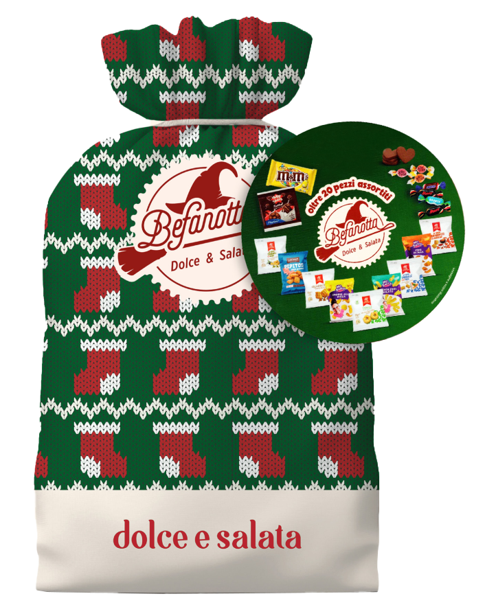 La Befanotta Dolce & Salata è la calza perfetta per celebrare l’Epifania con gusto e allegria. Realizzata con una simpatica fantasia a maglia natalizia e decorata con l’iconico logo Befanotta, contiene oltre 20 pezzi assortiti tra snack dolci e salati pensati per soddisfare tutti i palati. All’interno troverai un mix colorato e goloso di prodotti: caramelle, cioccolatini, snack salati, mini dolcetti e tante altre sorprese, ideale sia per bambini che per adulti. È la calza che unisce tradizione, qualità e divertimento, perfetta da regalare o da gustare in famiglia. Dolce e salata: il meglio dei due mondi in un’unica calza!