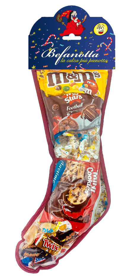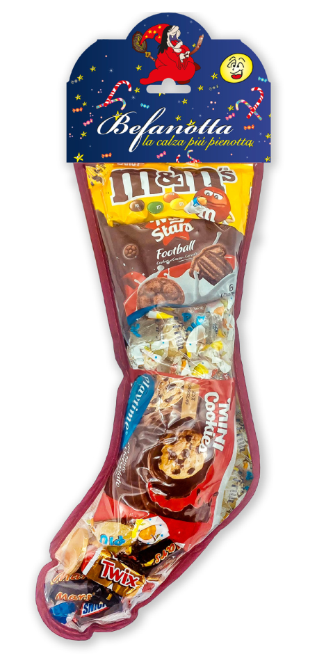 La Befanotta è una calza della Befana ricca e colorata, perfetta per festeggiare l’Epifania con tanta dolcezza. Realizzata in plastica trasparente a forma di calza, lascia intravedere un assortimento generoso di snack e dolciumi delle marche più amate. All’interno trovi golosità come M&M’s, Twix, Mars mini, biscotti Mini Cookies, cioccolatini assortiti e tante altre sorprese che rendono questa calza ideale per bambini e adulti.