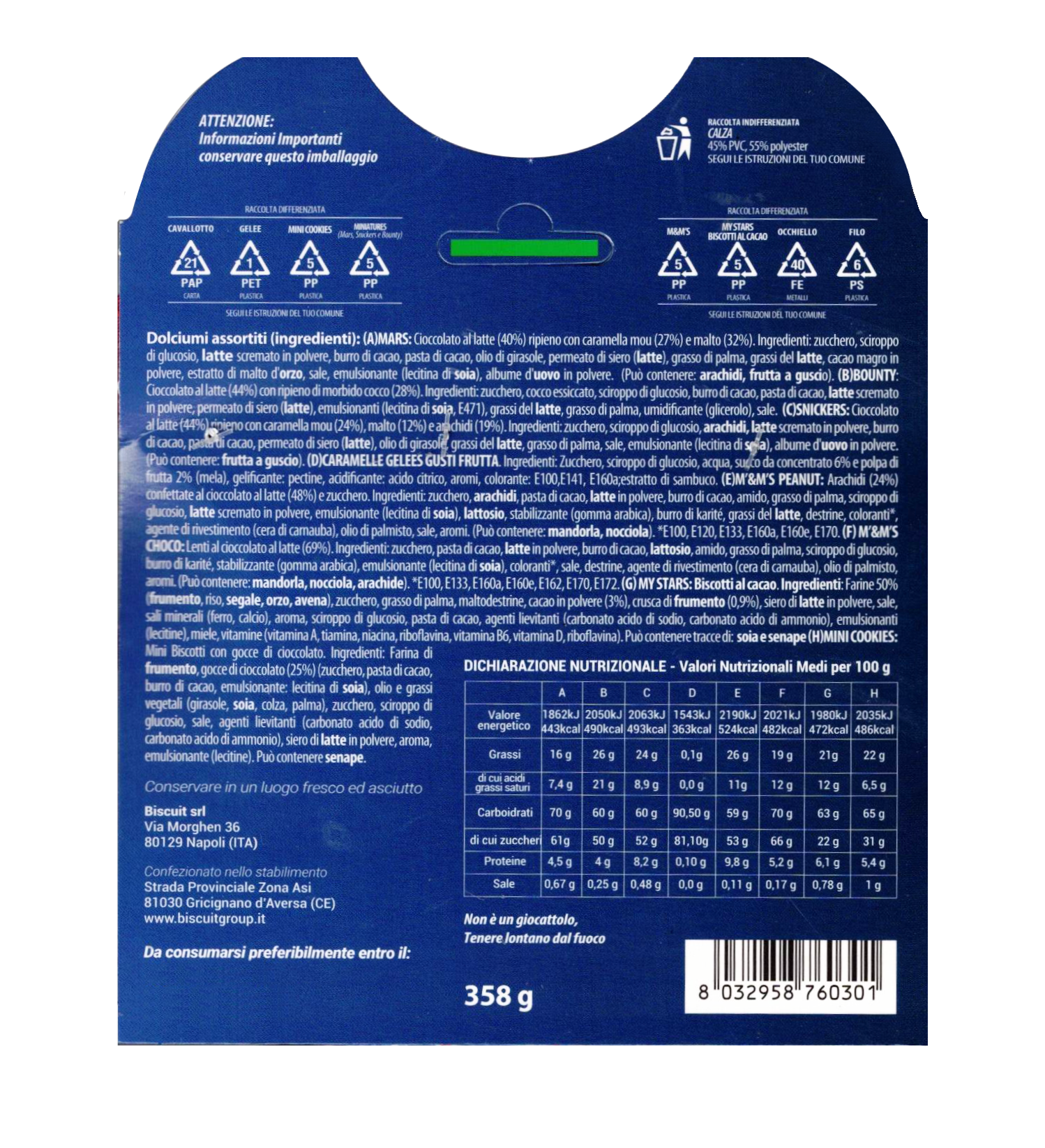 Ingredienti: Dolciumi assortiti (ingredienti): (A)MARS: Cioccolato al latte (40%) ripieno con caramella mou (27%) e malto (32%). Ingredienti: zucchero, sciroppo di glucosio, latte scremato in polvere, burro di cacao, pasta di cacao, olio di girasole, permeato di siero (latte), grasso di palma, grassi del latte, cacao magro in polvere, estratto di malto d’orzo, sale, emulsionante (lecitina di soia), albume d’uovo in polvere. (Può contenere: arachidi, frutta a guscio). (B)BOUNTY: Cioccolato al latte (44%) con ripieno di morbido cocco (28%). Ingredienti: zucchero, cocco essiccato, sciroppo di glucosio, burro di cacao, pasta di cacao, latte scremato in polvere, permeato di siero (latte), emulsionanti (lecitina di soia, E471), grassi del latte, grasso di palma, umidificante (glicerolo), sale. (C)SNICKERS: Cioccolato al latte (44%) ripieno con caramella mou (24%), malto (12%) e arachidi (19%). Ingredienti: zucchero, sciroppo di glucosio, arachidi, latte scremato in polvere, burro di cacao, pasta di cacao, permeato di siero (latte), olio di girasole, grassi del latte, grasso di palma, sale, emulsionante (lecitina di soia), albume d’uovo in polvere. (Può contenere: frutta a guscio). (D)CARAMELLE GELEES GUSTI FRUTTA. Ingredienti: Zucchero, sciroppo di glucosio, acqua, succo da concentrato 6% e polpa di
