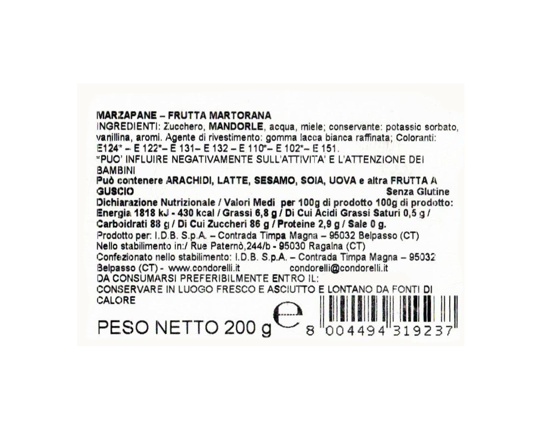La Frutta Martorana Condorelli da 200g è una raffinata specialità della pasticceria siciliana realizzata con marzapane alle mandorle e modellata per riprodurre realisticamente la frutta fresca. Ogni pezzo è incartato singolarmente e presentato in una pratica cassetta elegante, perfetta come dolce tradizionale da fine pasto, da condividere o come idea regalo gourmet.