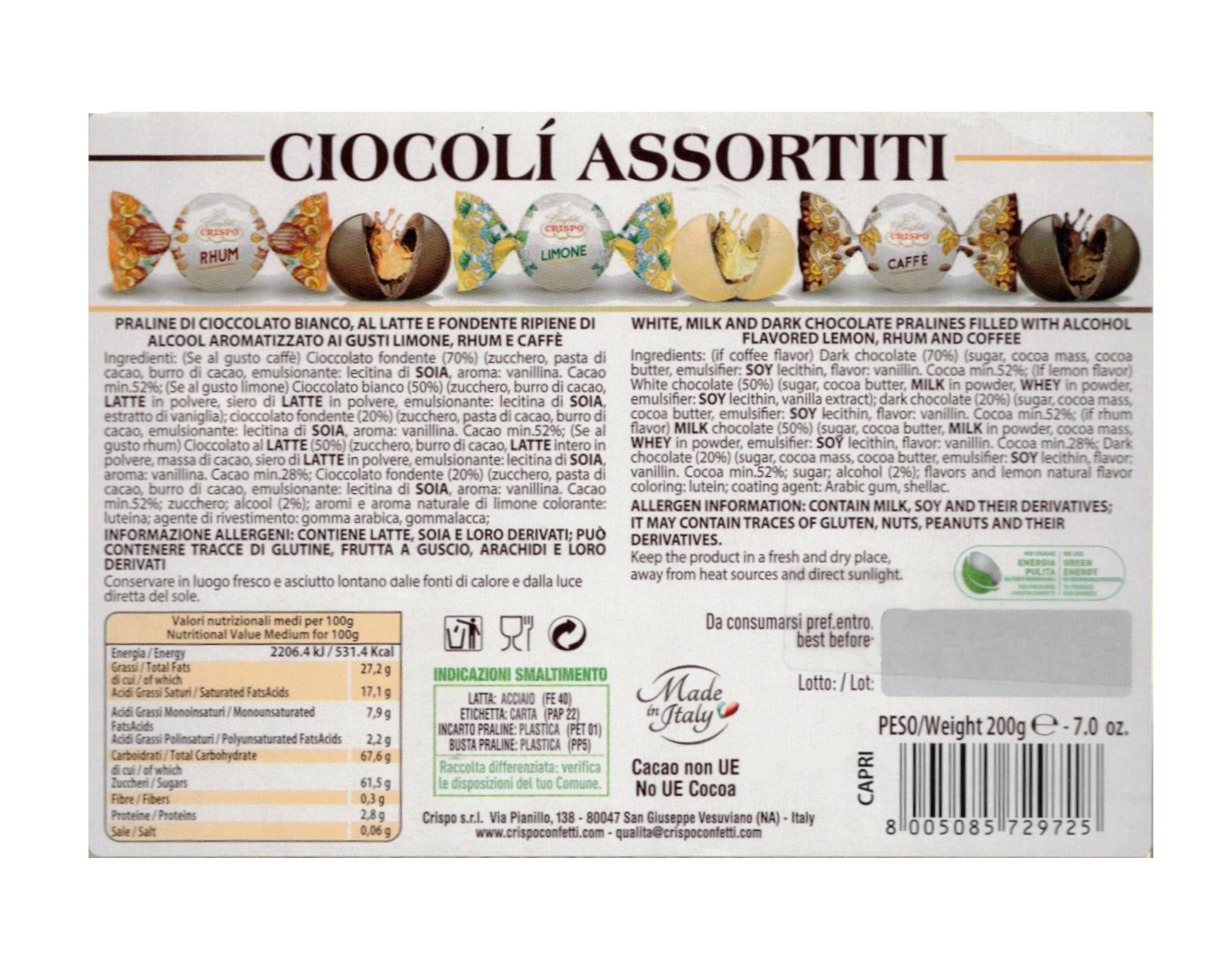 Ingredienti: zucchero, pasta di cacao, burro di cacao, cacao magro in polvere, latte in polvere, latte intero in polvere, siero di latte in polvere, alcool, aromi, aroma naturale di limone, caffè, emulsionante: lecitina di soia, estratto di vaniglia, colorante: luteina, agente di rivestimento: gomma arabica, gommalacca