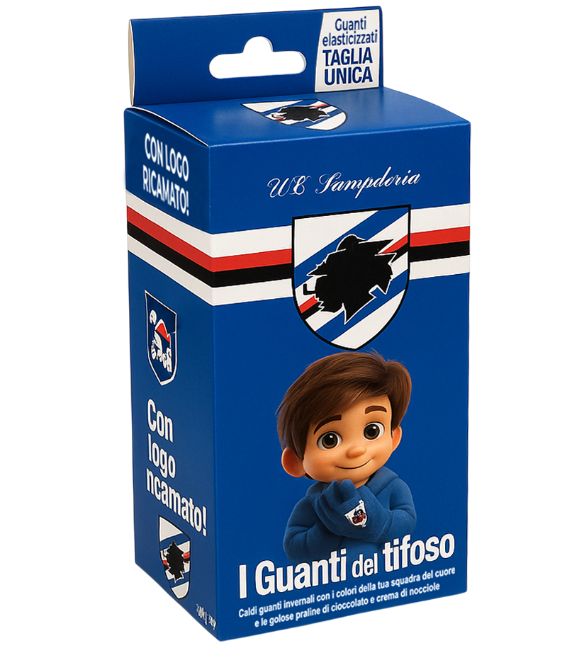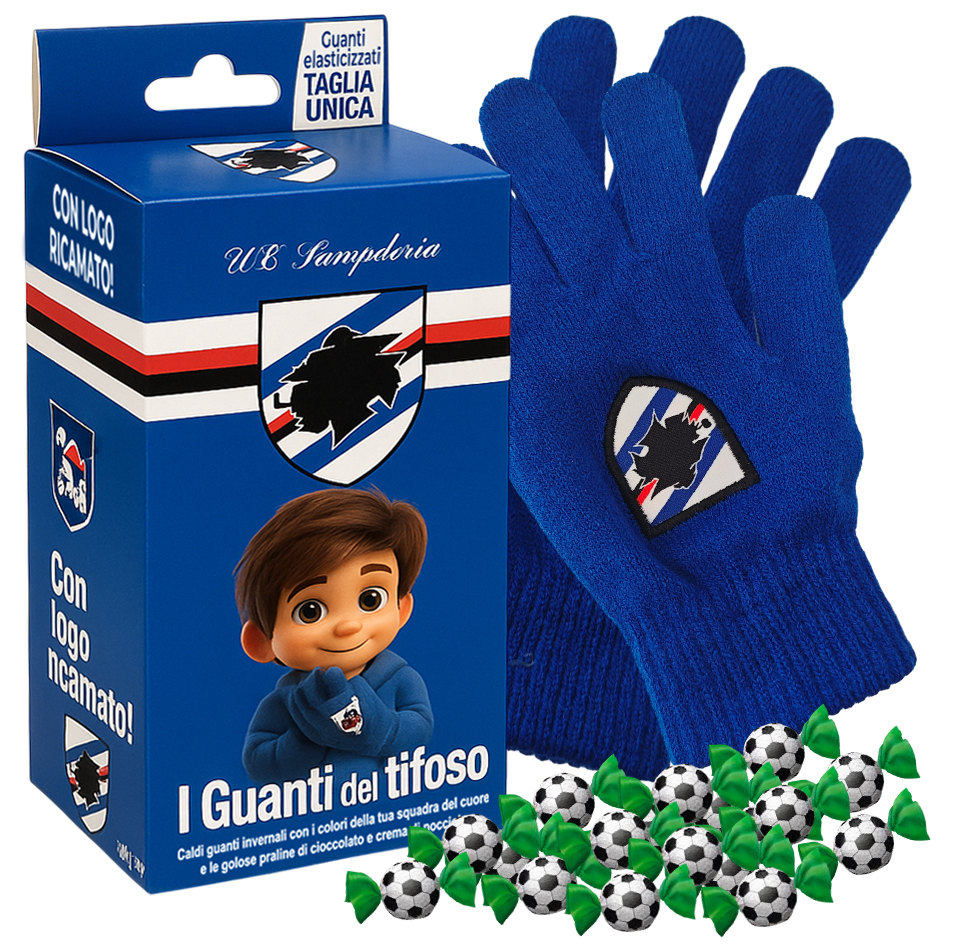 Scopri i Guanti del Tifoso Icam, un’esclusiva combinazione di passione calcistica e dolcezza! Questo set unico include un paio di guanti invernali (taglia unica) con il logo ufficiale della squadra ricamato e una deliziosa confezione da 80g di praline al cioccolato al latte con ripieno alla nocciola. I guanti, realizzati in morbido materiale elasticizzato a taglia unica, ti terranno al caldo durante le partite mentre mostri con orgoglio i colori della tua squadra del cuore. Le praline, confezionate individualmente con un design a forma di pallone da calcio, sono perfette da gustare durante le partite o da condividere con altri tifosi. Un regalo ideale per ogni appassionato di calcio che unisce il comfort per le fredde giornate allo stadio con il piacere di un delizioso snack al cioccolato. La confezione include sia i guanti che le praline, presentati in un’elegante scatola decorata con i colori della squadra.