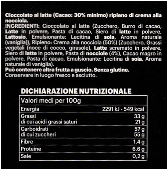Cioccolato al latte (Zucchero, Burro di cacao, Latte in polvere, Pasta di cacao, Siero di latte in polvere, Lattosio, Emulsionante: lecitina di soia, Aroma naturale (vaniglia)), Ripieno: Crema alla nocciola (50%) (Zucchero, Grassi vegetali (noce di cocco, girasole), Latte scremato in polvere, Siero di latte in polvere, Pasta di nocciole (4%), Cacao magro in polvere, Pasta di cacao, Emulsionante: lecitina di soia, Aroma naturale di vaniglia). Può contenere altra frutta a guscio. Senza glutine.