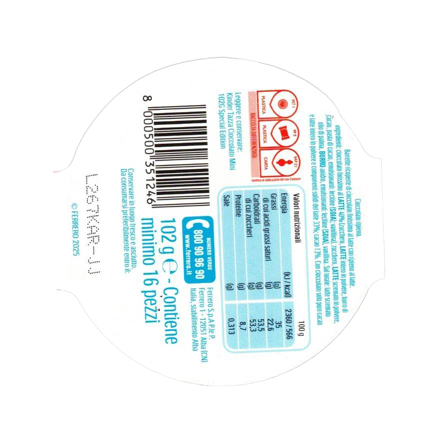 Ingredienti: zucchero, latte scremato in polvere, burro di cacao, pasta di cacao, grassi vegetali (palma), emulsionanti (lecitina di soia), aromi