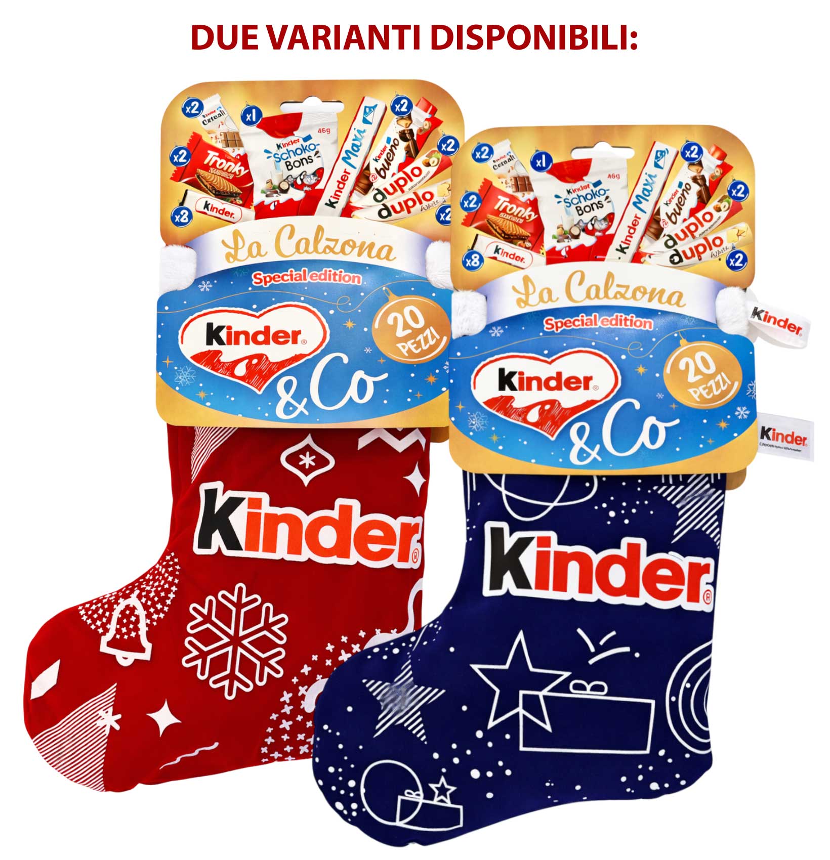 Porta la magia delle festività nella tua casa con la Kinder & Co. “La Calzona” Special Edition! Questa deliziosa calza dell’Epifania è disponibile in due eleganti colori – BLU o ROSSA – ed è ricca di prelibatezze Kinder che faranno felici grandi e piccini. Ogni calza contiene ben 20 pezzi di dolcetti assortiti per un totale di 416g di pura bontà: Kinder Cereali, Tronky Sandwich, Kinder Cioccolato, Schokobons, Kinder Maxi, Kinder Bueno e Duplo Riegel sia al latte che al cioccolato bianco. Questa edizione speciale è il regalo perfetto per celebrare l’Epifania con i tuoi cari, combinando la tradizione della calza con i famosi dolci Kinder amati da tutti. Una sorpresa golosa che renderà ancora più speciale la festa della Befana!