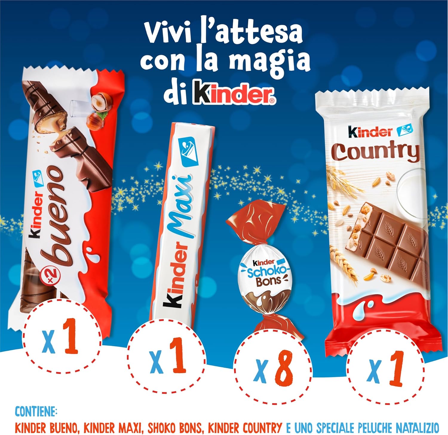 Porta la magia del Natale a casa tua con il Kinder Maxi Mix Peluche Natalizio ELFA! Questo adorabile peluche a forma di elfo natalizio con cappello rosso e dettagli verdi è accompagnato da una deliziosa selezione di cioccolatini Kinder. All’interno della confezione regalo troverai 133g di prelibatezze: Kinder Schokobons, Kinder Bueno, Kinder Maxi e Kinder Cereali. La confezione festiva presenta un design natalizio con sfondo blu stellato e dettagli invernali. Perfetto come regalo per bambini o come decorazione natalizia golosa, questo set combina il piacere del cioccolato Kinder con un morbido peluche che potrà essere conservato anche dopo aver gustato tutte le delizie. Un’idea regalo originale che porterà dolcezza e allegria durante le festività natalizie.