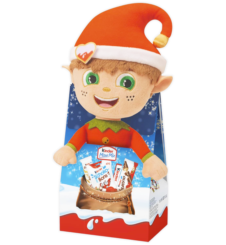 Porta la magia del Natale nelle tue festività con il Kinder Maxi Mix Peluche Natalizio ELFO! Questo adorabile elfo natalizio non è solo un delizioso peluche decorativo, ma nasconde anche un tesoro di prelibatezze Kinder all’interno. La confezione da 133g include una selezione dei più amati cioccolatini Kinder: i croccanti Kinder Schokobons, il cremoso Kinder Bueno, il classico Kinder Maxi e i nutrienti Kinder Cereali.
