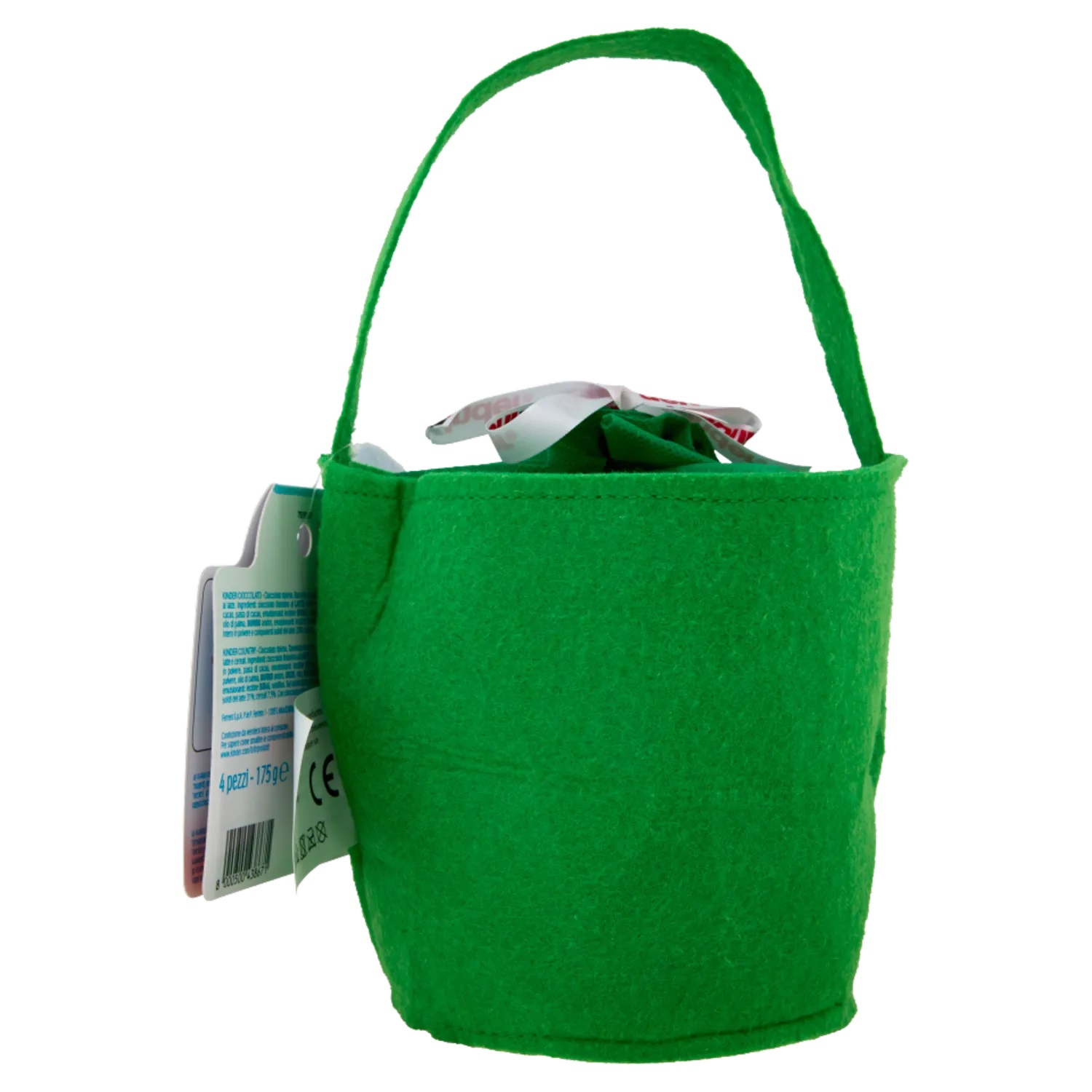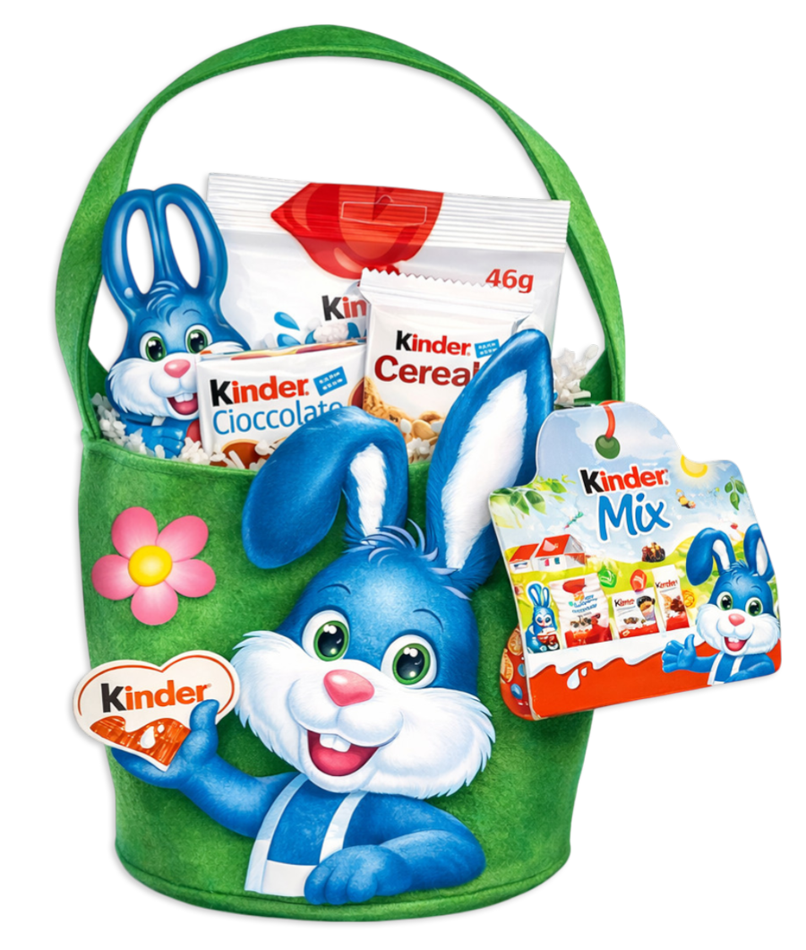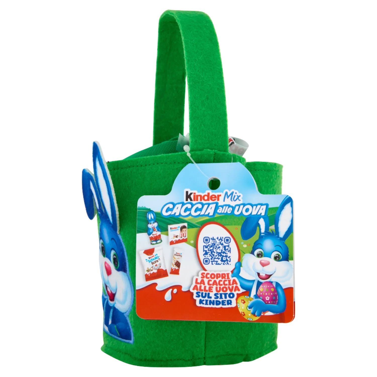 Kinder Mix Caccia alle Uova è un simpatico sacchetto pasquale decorato con coniglietto contenente 4 specialità assortite Kinder: Kinder Cioccolato, Kinder Schoko-Bons, Kinder Cereali e Kinder Figura Cava Coniglietto. Una proposta da 175 g perfetta come idea regalo di Pasqua, per la caccia alle uova o per arricchire un cesto pasquale con un tocco allegro e goloso.