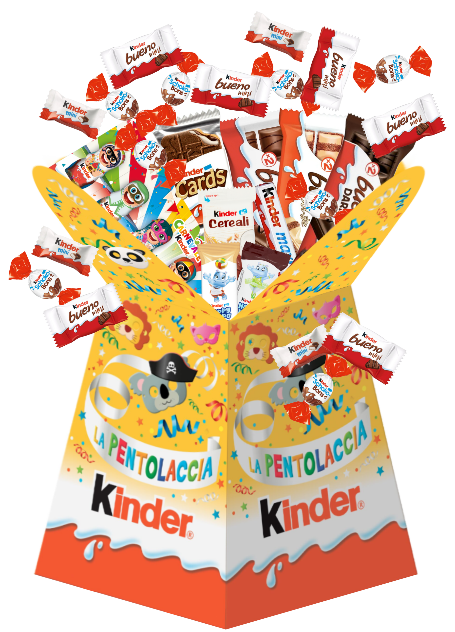 Celebra il Carnevale con un kit Kinder super assortito! Questa pentolaccia di Carnevale vuota originale Kinder è perfetta per feste, ricorrenze o regali: con design colorato a tema e personaggi divertenti. L’offerta include tutti i dolci Kinder elencati, spediti separatamente: 3 Kinder Cereali, 3 Kinder Maxi, 3 Happy Hippo alla nocciola, 3 Happy Hippo al cioccolato, 1 figure cava di Carnevale, 1 Kinder Bueno, 1 Kinder Bueno White, 1 Kinder Bueno Dark, 2 Kinder Cards, 1 busta di Kinder Bueno Mini, 1 busta di Cioccolato Mini e 1 busta di Schokobons al latte. Tutti i prodotti inclusi sono originali Kinder confezionati singolarmente. Una soluzione pratica e golosa per personalizzare il tuo Carnevale con dolcezza, con prodotti amati da grandi e piccini.