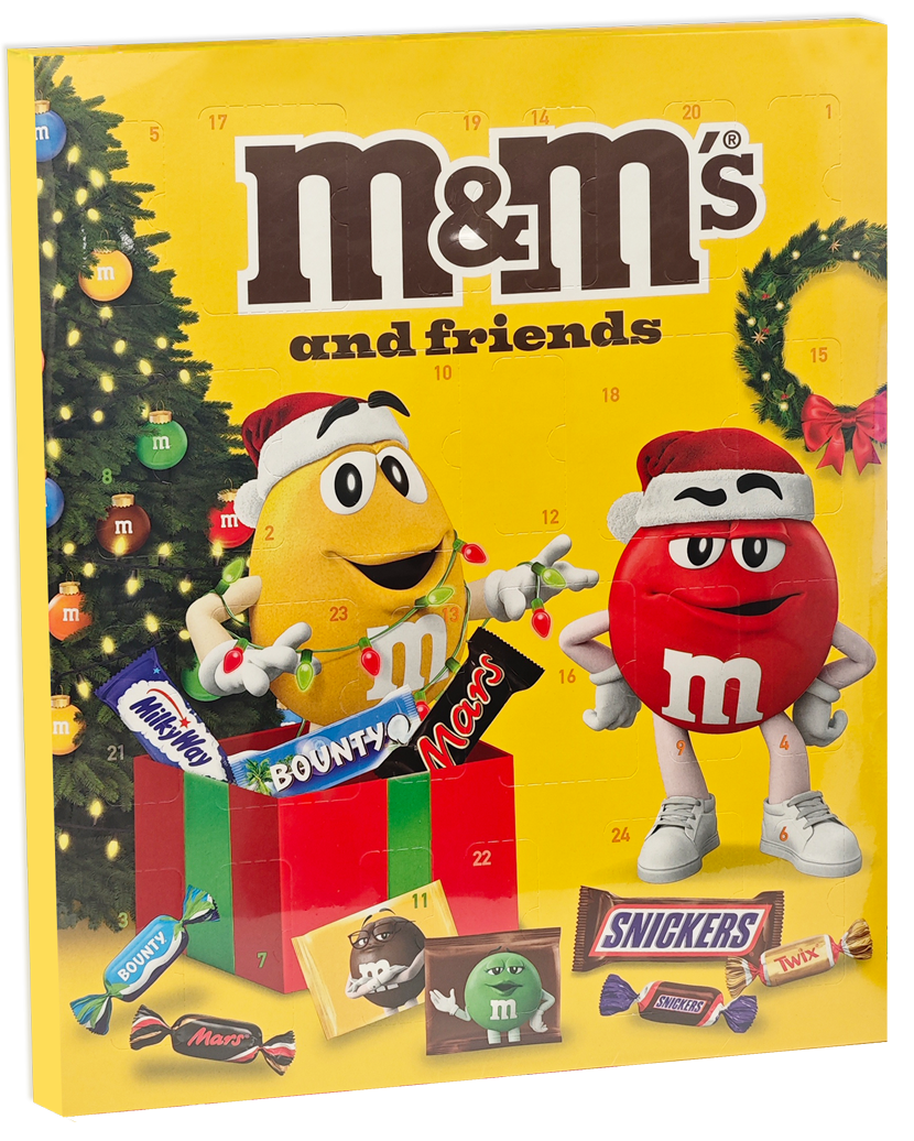 Celebra il conto alla rovescia natalizio con questo delizioso calendario dell’avvento M&M’s da 361g! Ogni giorno rivela una nuova sorpresa golosa con una selezione di cioccolatini assortiti che include le varietà al latte, caramello mou, cocco e arachidi, oltre alle classiche lenti al cioccolato. La confezione presenta un vivace design natalizio in giallo con i famosi personaggi M&M’s che decorano l’albero e preparano i regali.