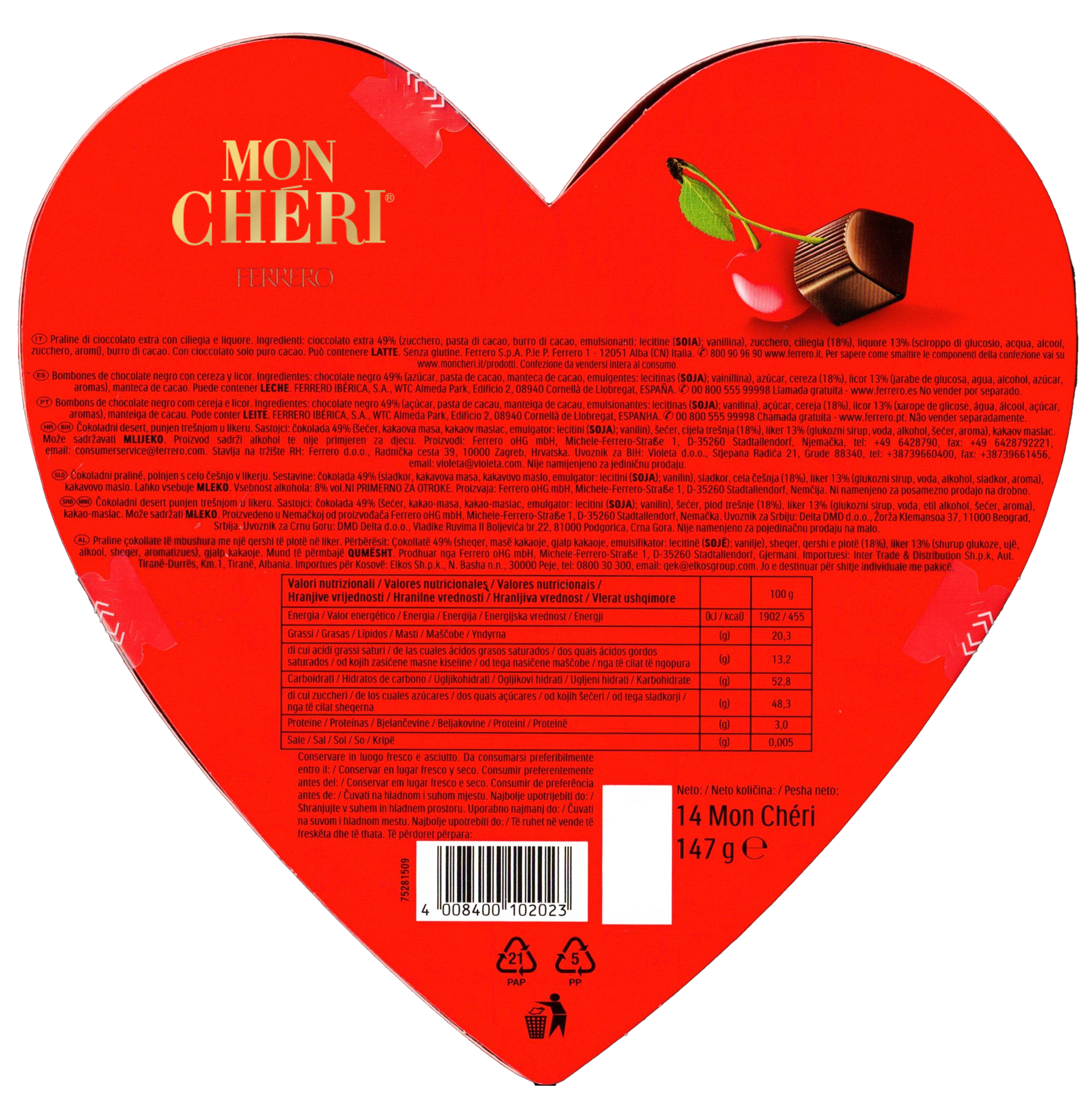 La scatola contiene 14 Mon Cheri. Il gusto ti stupisce ad ogni assaggio. La croccantezza del cioccolato fondente, l’intensità del liquore e la dolcezza della ciliegia: tre ingredienti autentici, per un’armonia di piacere unico.