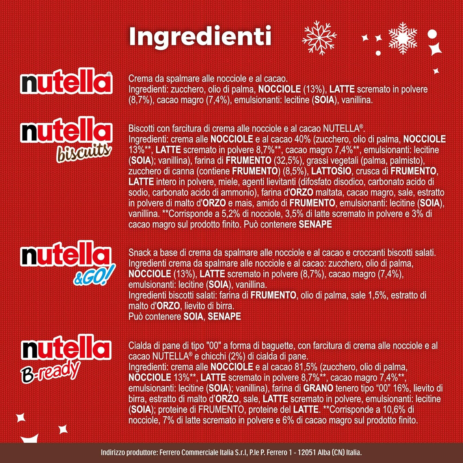 Nutella&Go: Crema da spalmare alle nocciole e al cacao: Zucchero, olio di palma, NOCCIOLE (13%), LATTE scremato in polvere (8,7%) cacao magro (7,4%), emulsionanti: lecitina (SOIA), vanillina. Biscotti salati: Farina di FRUMENTO, olio di palma, sale (1,5%), estratto di malto d’ORZO, lievito di birra.