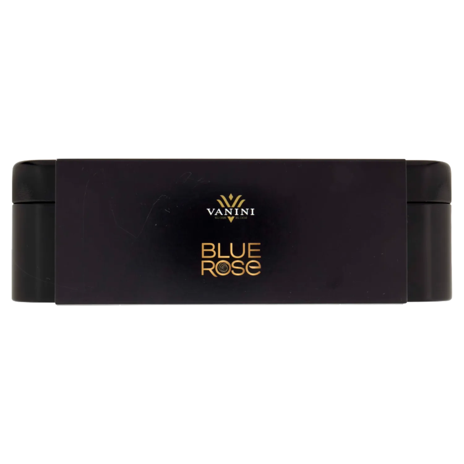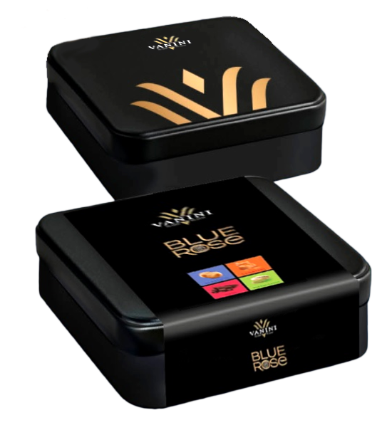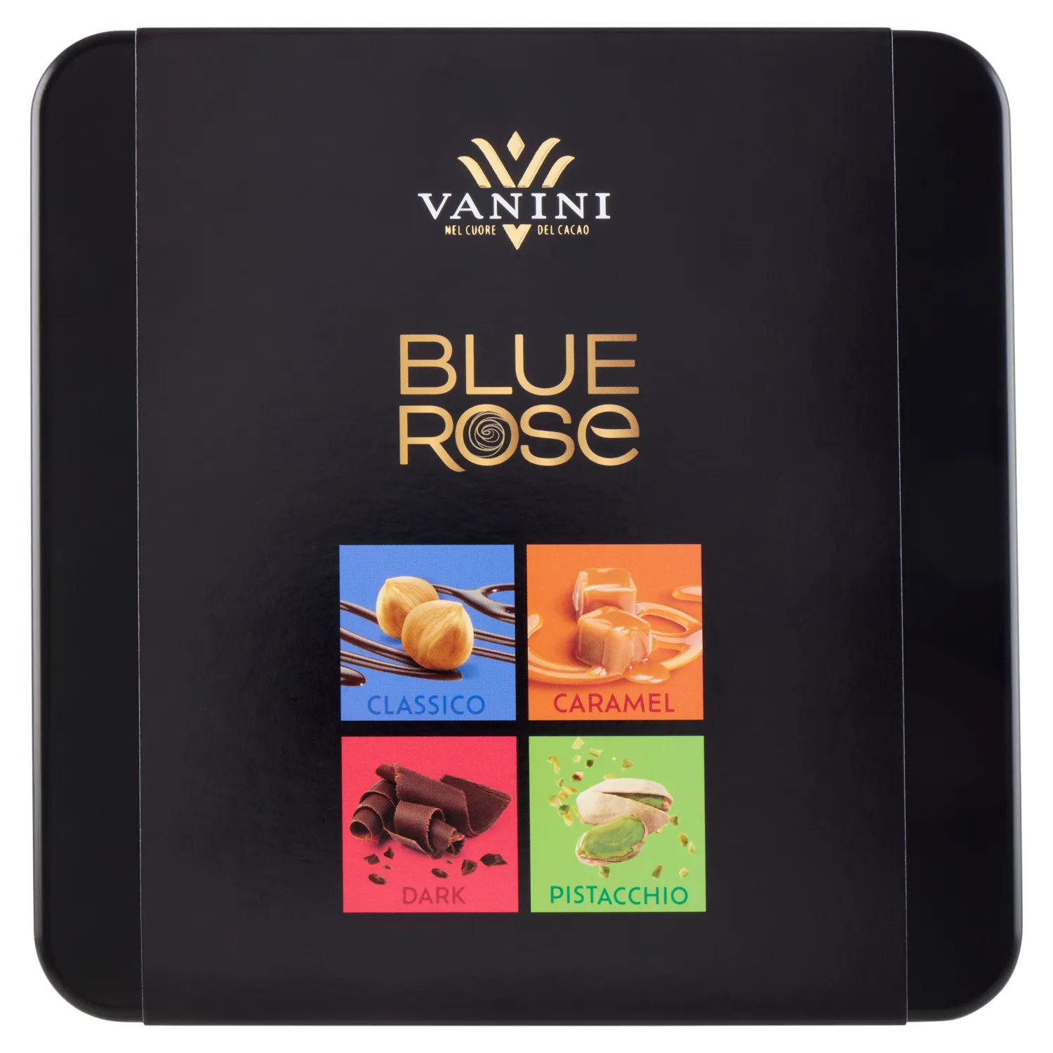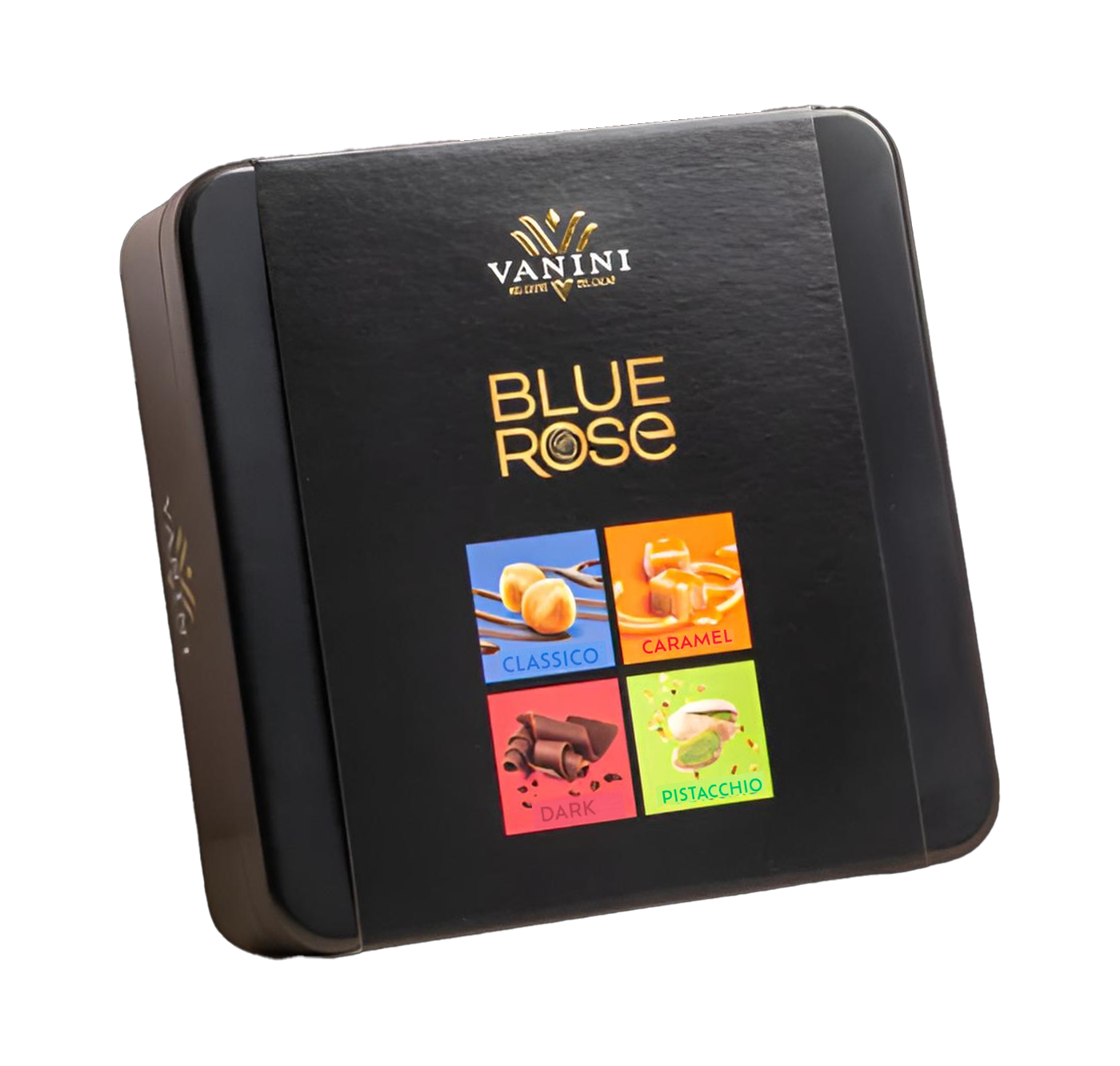 Scopri la raffinatezza della Confezione in Latta Vanini Blue Rose, un elegante cofanetto che racchiude una selezione di praline assortite al latte, fondente, caramello e pistacchio.