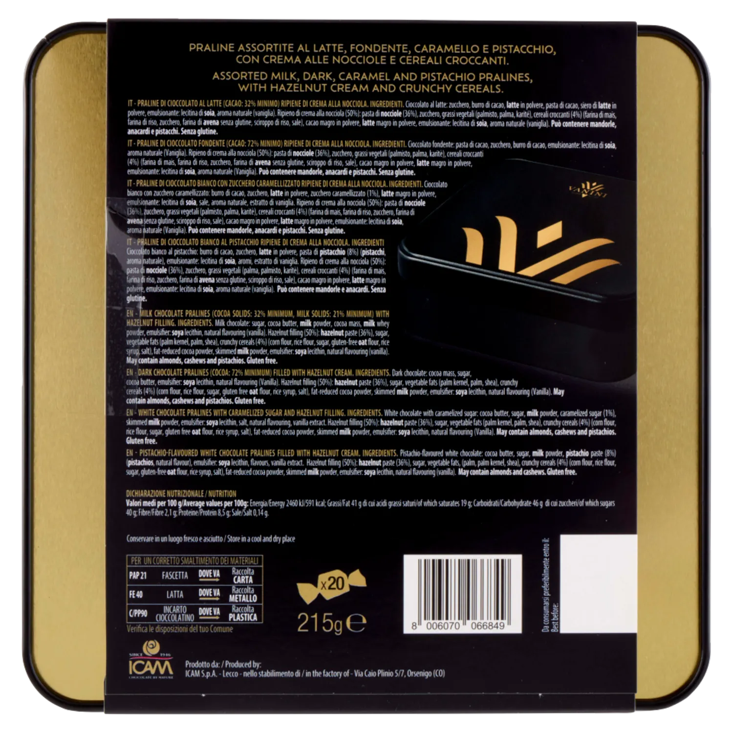 Ingredienti: Cioccolato al latte: Zucchero, Burro di cacao, Latte in polvere, Pasta di cacao, Siero di latte in polvere, Emulsionante: Lecitina di soia, Aroma naturale (Vaniglia). Ripieno di crema alla nocciola (50%): Pasta di Nocciole (36%), Zucchero, Grassi vegetali (Palmisto, Palma, Karitè), Cereali croccanti (4%) (Farina di mais, Farina di riso, Zucchero, Farina di avena senza glutine, Malto d’orzo senza glutine, Sale), Cacao magro in polvere, Latte magro in polvere, Emulsionante: lecitina di soia, Aroma naturale (Vaniglia). Può contenere mandorle, anacardi e pistacchi. Senza glutine.