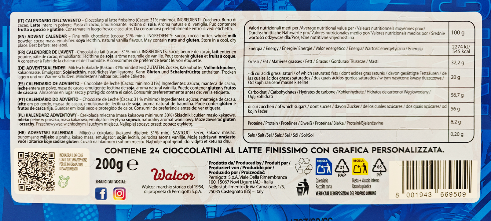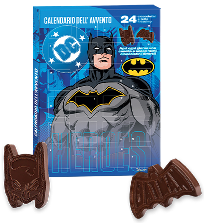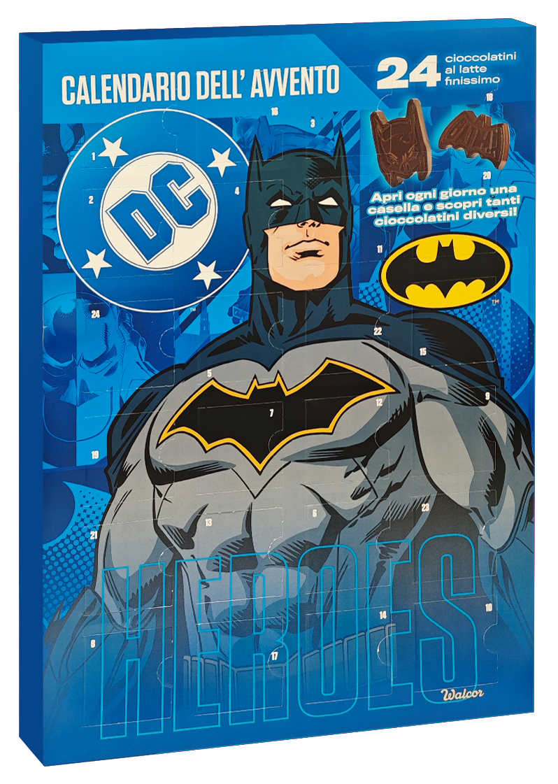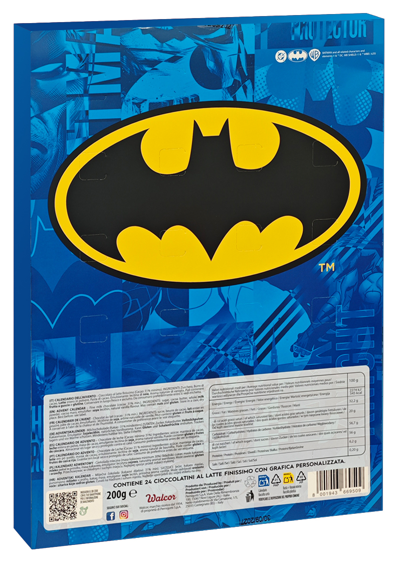 Rendi magico il conto alla rovescia verso il Natale con questo esclusivo Calendario dell’Avvento di Batman! Ogni giornata rivela una deliziosa sorpresa con 24 cioccolatini al latte finissimo (31% di cacao minimo) dalla forma unica ispirata all’iconico supereroe di Gotham. Realizzato da Walcor, questo calendario da 200g presenta una straordinaria grafica in blu con il Cavaliere Oscuro in primo piano, perfetto per i fan di tutte le età.