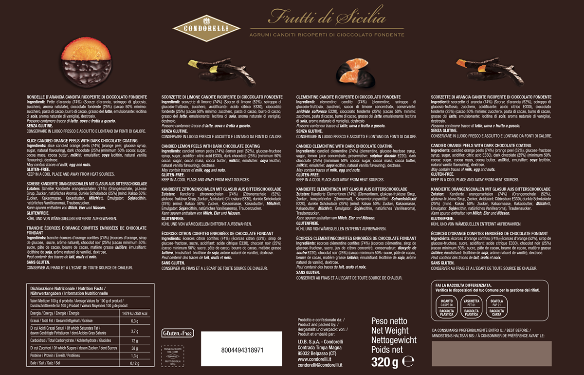 Ingredienti: fette d’arancia (74%), scorzette di limone (74%), clementine candite (74%), scorzette di arancia (74%), zucchero, cioccolato fondente (25%)