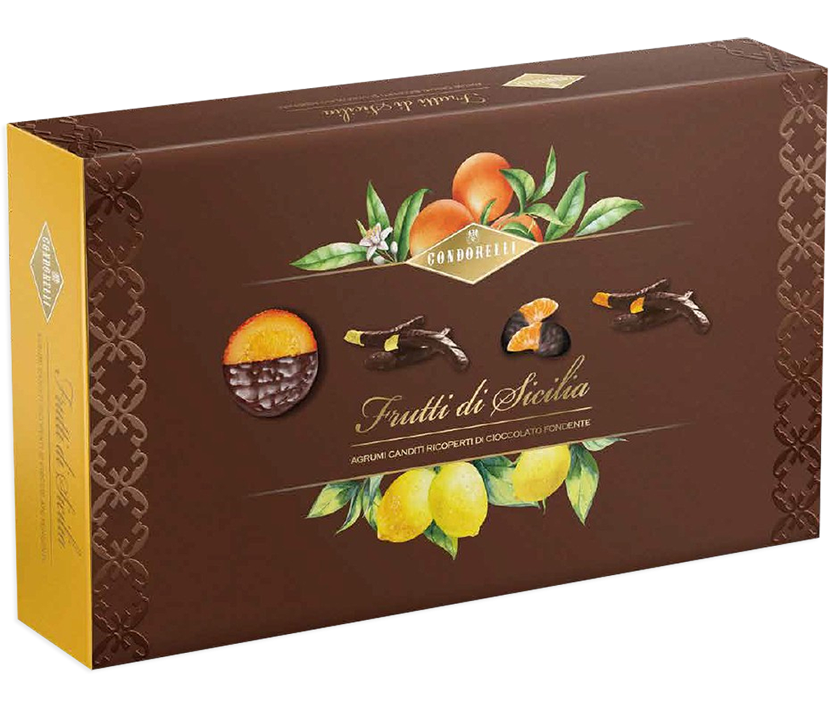 Scopri la Scatola Elegante Frutti di Sicilia con Agrumi Canditi Ricoperti di Cioccolato Fondente, un delizioso assortimento da 320g che unisce la freschezza della frutta secca e degli agrumi canditi alla ricchezza del cioccolato fondente!