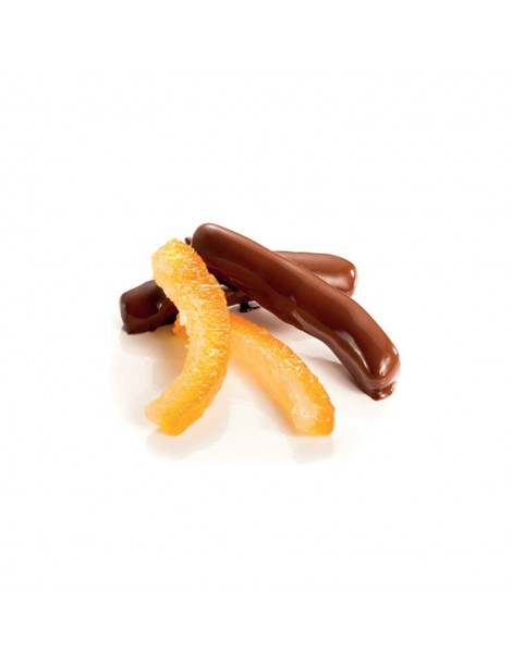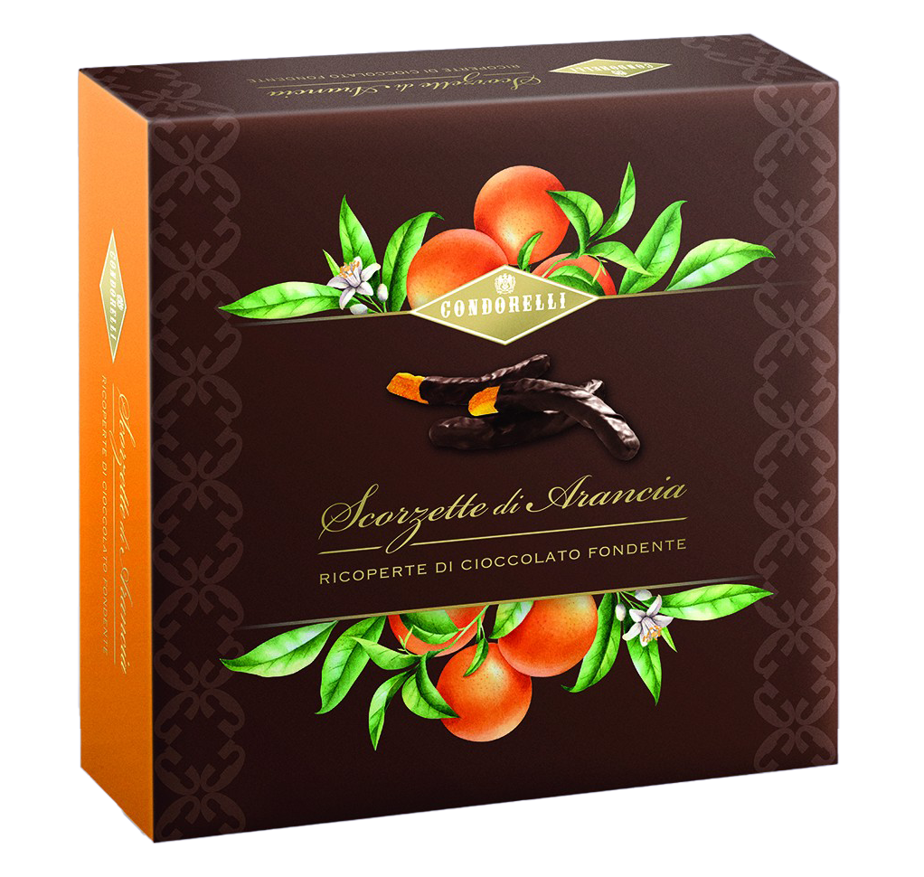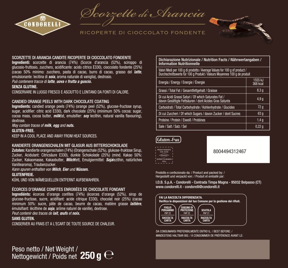 Ingredienti: scorzette di arancia (74%) (Scorze d’arancia (52%), sciroppo di glucosio-fruttosio, zucchero, acidificante: acido citrico E330), cioccolato fondente (25%) (cacao 50% minimo: zucchero, pasta di cacao, burro di cacao, grasso del latte, emulsionante: lecitina di soia, aroma naturale di vaniglia), destrosio. Può contenere tracce di latte, uova e frutta a guscio. SENZA GLUTINE