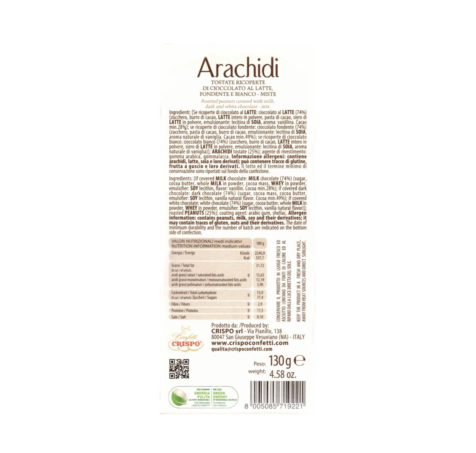 Un piccolo capolavoro di gusto firmato Crispo. Le Arachidi tostate ricoperte di finissimo cioccolato conquistano al primo assaggio grazie al perfetto equilibrio tra croccantezza e cremosità.