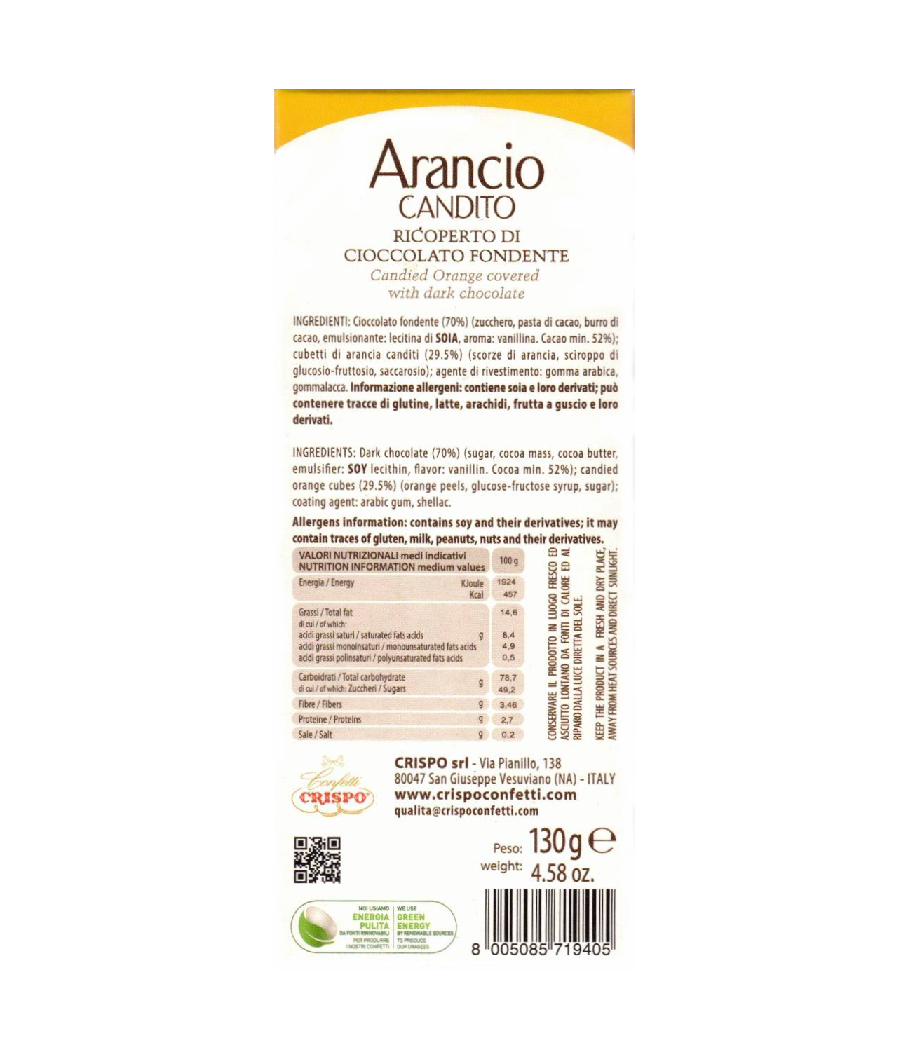 Ingredienti: Cioccolato fondente 70% (zucchero, pasta di cacao, burro di cacao, emulsionante: lecitina di soia, aroma: vanillina), cubetti di arancia canditi 29,5% (scorze di arancia, sciroppo di glucosio-fruttosio, saccarosio), agente di rivestimento: gomma arabica, gommalacca