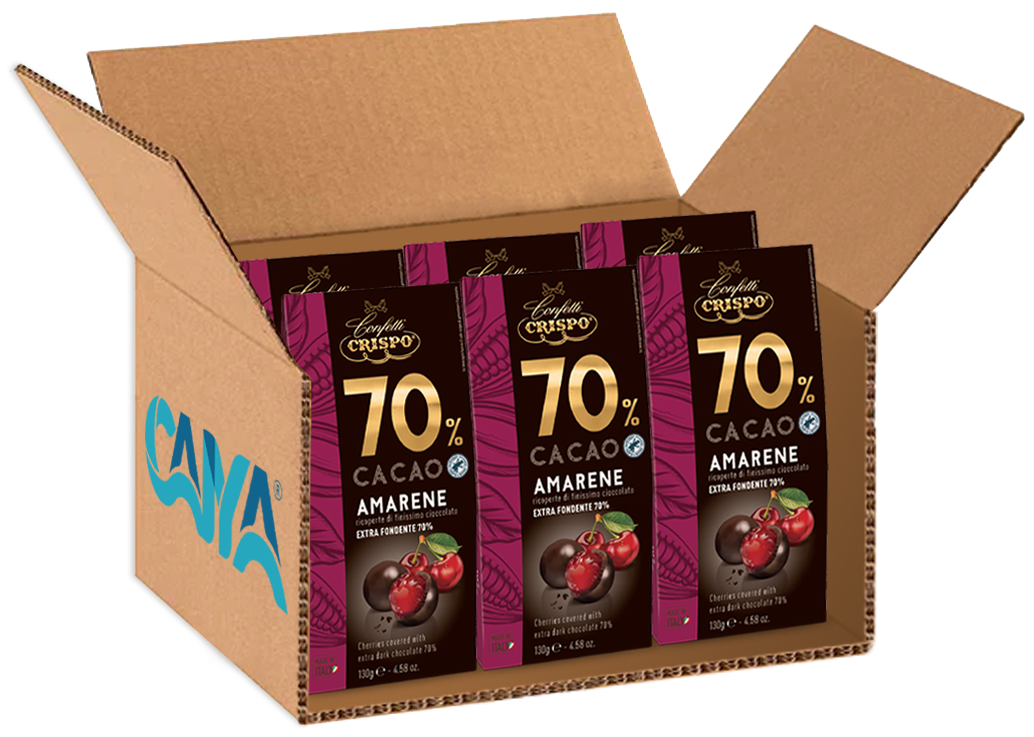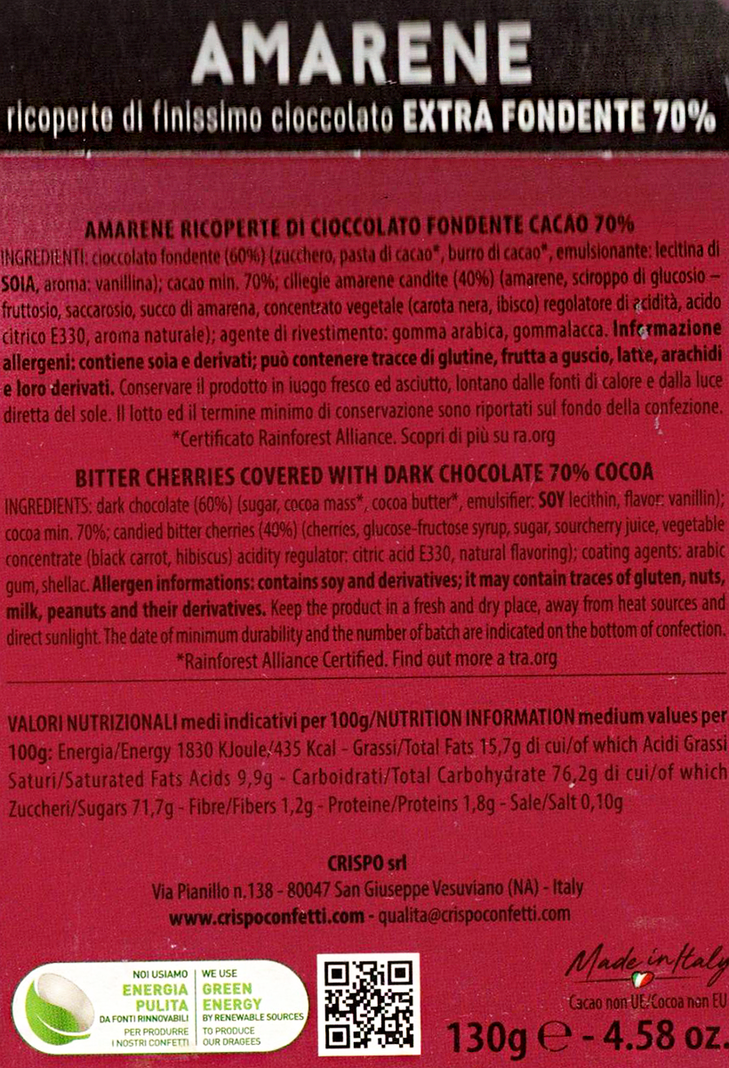 Ingredienti: Cioccolato fondente (60%) (zucchero, pasta di cacao, burro di cacao, emulsionante: lecitina di SOIA, aroma: vanillina); cacao min. 70%; ciliegie amarene candite(40%) (ciliegie intere, sciroppo di glucosio – fruttosio, zucchero,colorante:E163,aroma, acidificante: E330, conservante:E220)