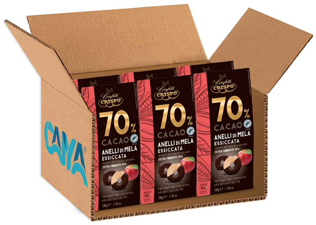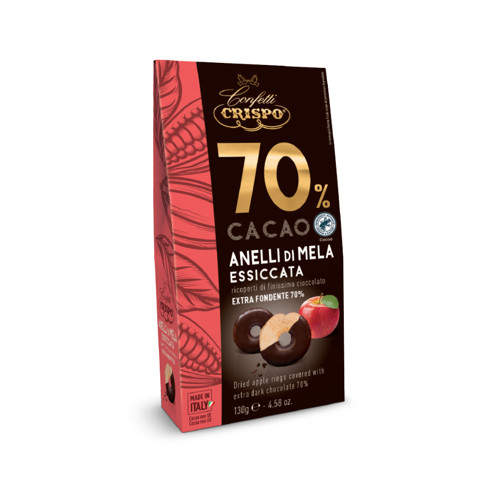 Scopri l’irresistibile combinazione degli anelli di mela essiccata avvolti nel finissimo cioccolato fondente al 70% di cacao con i Confetti Crispo. Questa deliziosa specialità italiana da 130g offre un’esperienza gustativa unica dove la dolcezza si sposa perfettamente con l’intensità del cioccolato extra fondente di alta qualità. Ogni confetto è accuratamente preparato per garantire un equilibrio perfetto tra il ripieno fruttato e la copertura di cioccolato fondente. Prodotto in Italia con ingredienti selezionati, questi confetti sono ideali come regalo raffinato o per un momento di puro piacere personale.