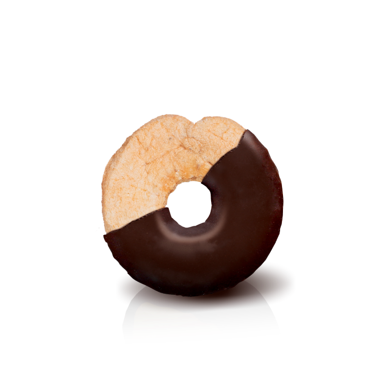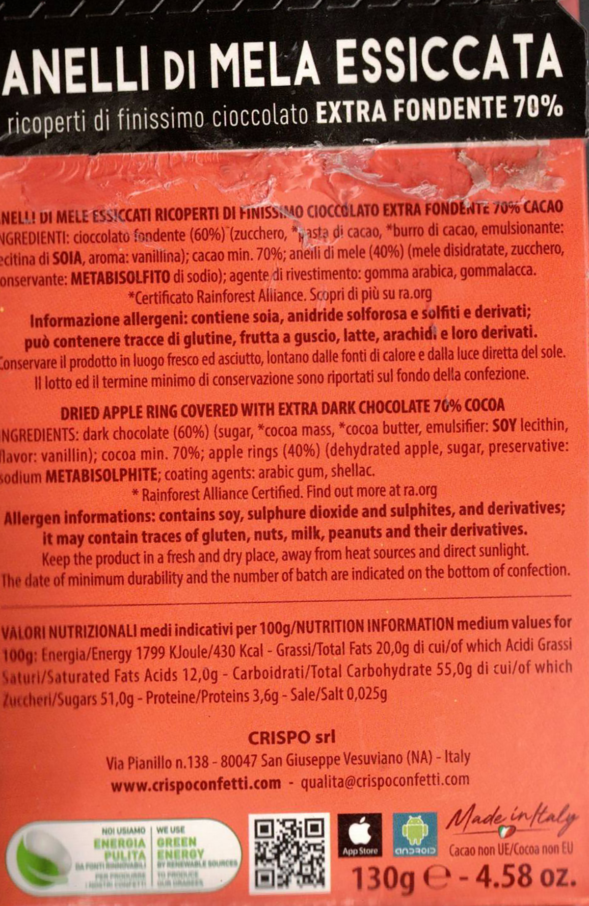 Ingredienti: Cioccolato fondente (60%) (zucchero, *pasta di cacao, *burro di cacao, emulsionante: lecitina di SOIA, aroma: vanillina); cacao min. 70%; anelli di mele (40%) (mele disidratate, zucchero, conservante: METABISOLFITO di sodio)