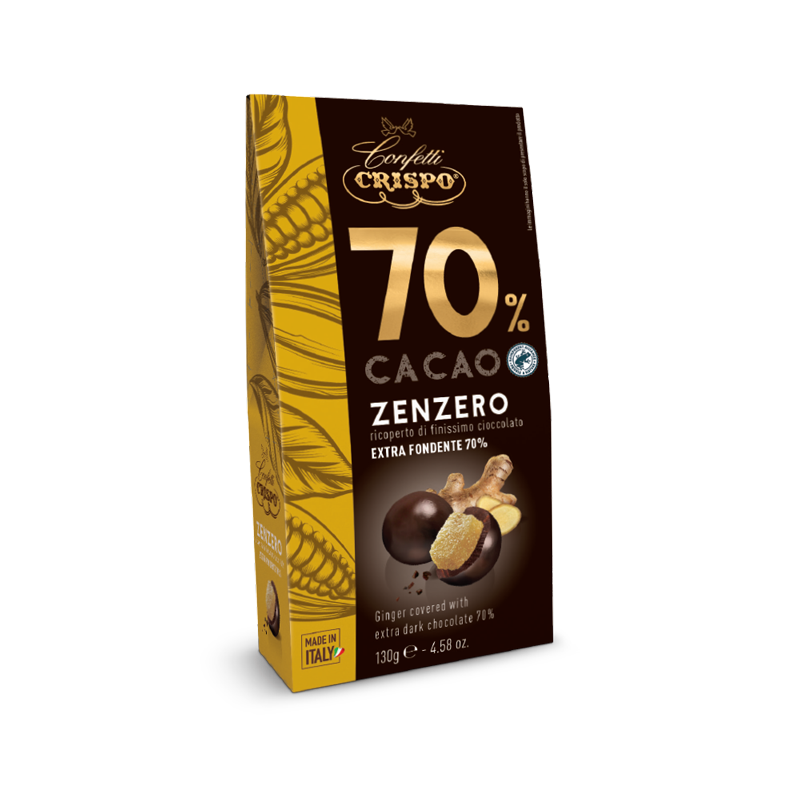 Scopri l’irresistibile combinazione dello zenzero avvolte nel finissimo cioccolato fondente al 70% di cacao con i Confetti Crispo. Questa deliziosa specialità italiana da 130g offre un’esperienza gustativa unica dove la dolcezza si sposa perfettamente con l’intensità del cioccolato extra fondente di alta qualità. Ogni confetto è accuratamente preparato per garantire un equilibrio perfetto tra il ripieno fruttato e la copertura di cioccolato fondente!
