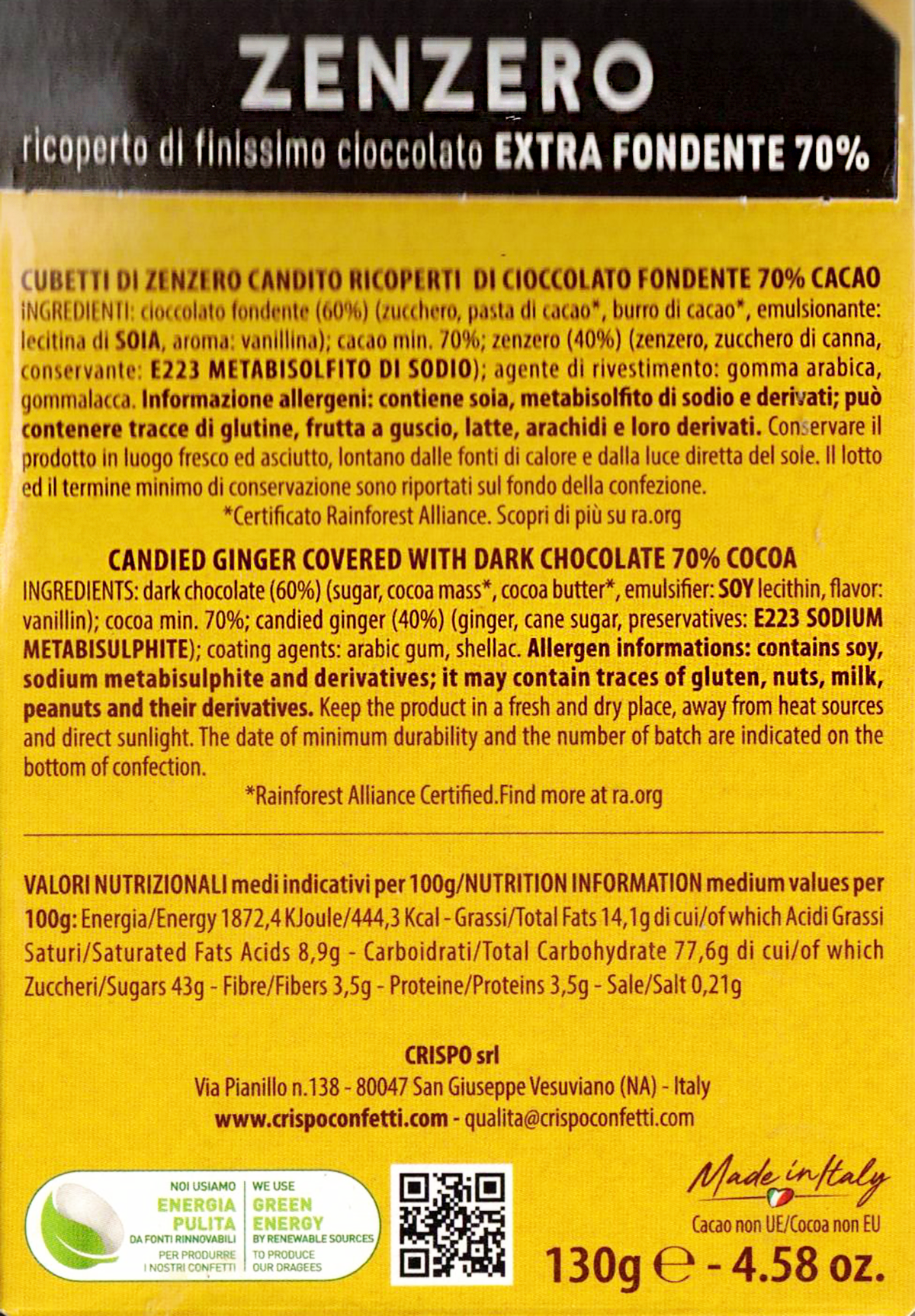 Ingredienti: Cioccolato fondente (60%) (zucchero, pasta di cacao, burro di cacao, emulsionante: lecitina di SOIA, aroma: vanillina); cacao min. 70%; zenzero (40%) (zenzero,zucchero di canna, conservante E223)