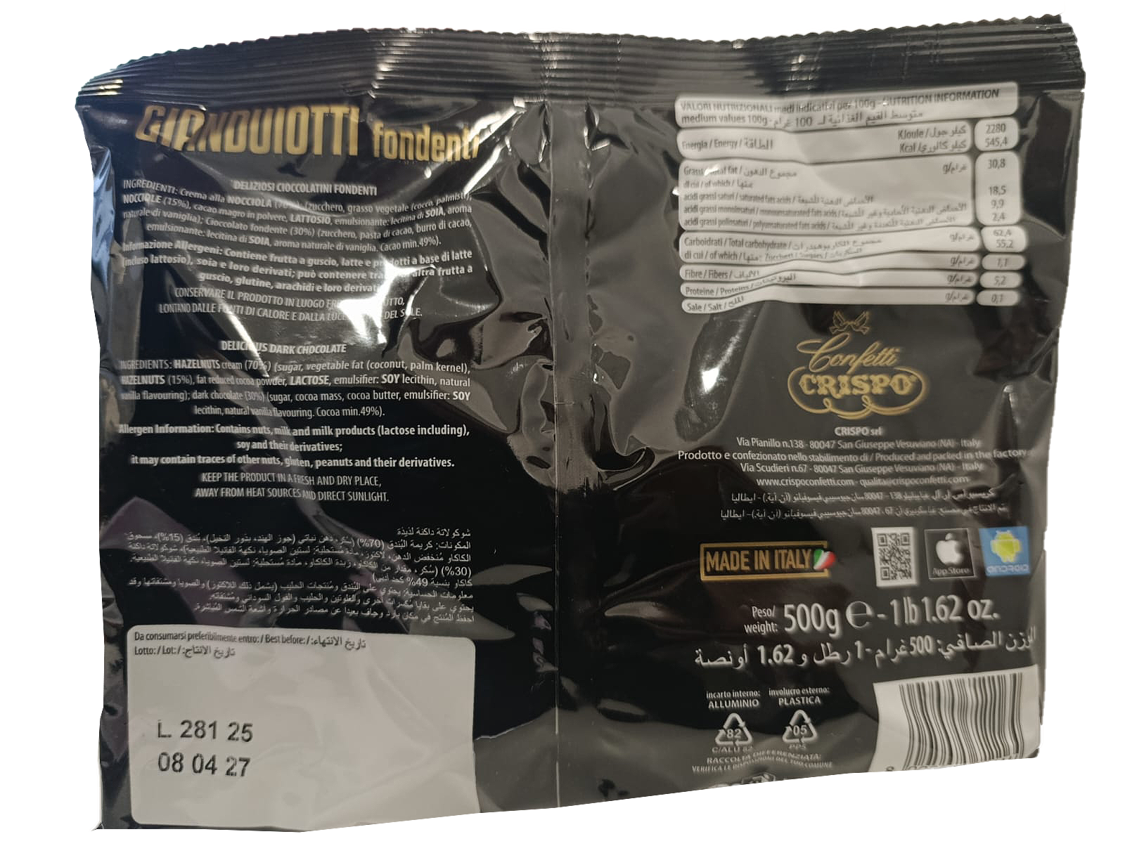 I Gianduiotti Confetti Crispo sono deliziosi cioccolatini che combinano il gusto raffinato della gianduia con il cioccolato bianco, creando un’esperienza di gusto unica e irresistibile. Realizzati in Italia con ingredienti di alta qualità, questi cioccolatini rappresentano l’eccellenza della tradizione dolciaria italiana. Ogni busta contiene 500g di prelibatezze perfette per ogni occasione: che si tratti di un momento di relax personale, di condivisione con amici e familiari, o come elegante pensiero regalo!