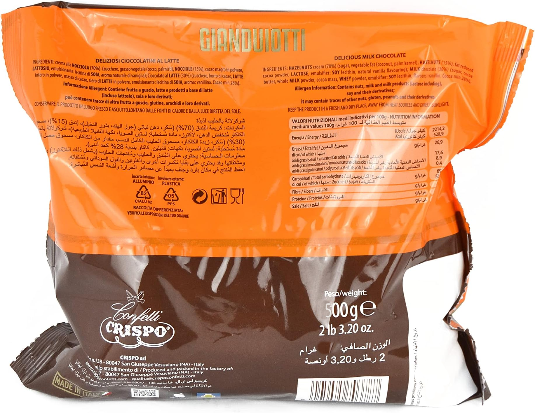 Crema alla NOCCIOLA (70%): (zucchero, grasso vegetale (cocco, palmisti), NOCCIOLE (15%), cacao magro in polvere, LATTOSIO, emulsionante: lecitina di SOIA, aroma naturale di vaniglia); Cioccolato al latte (30%) (zucchero, burro di cacao, LATTE intero in polvere,pasta di cacao, siero di LATTE in polvere, emulsionante: lecitina di SOIA,aromi:vanillina.Cacao min.28%