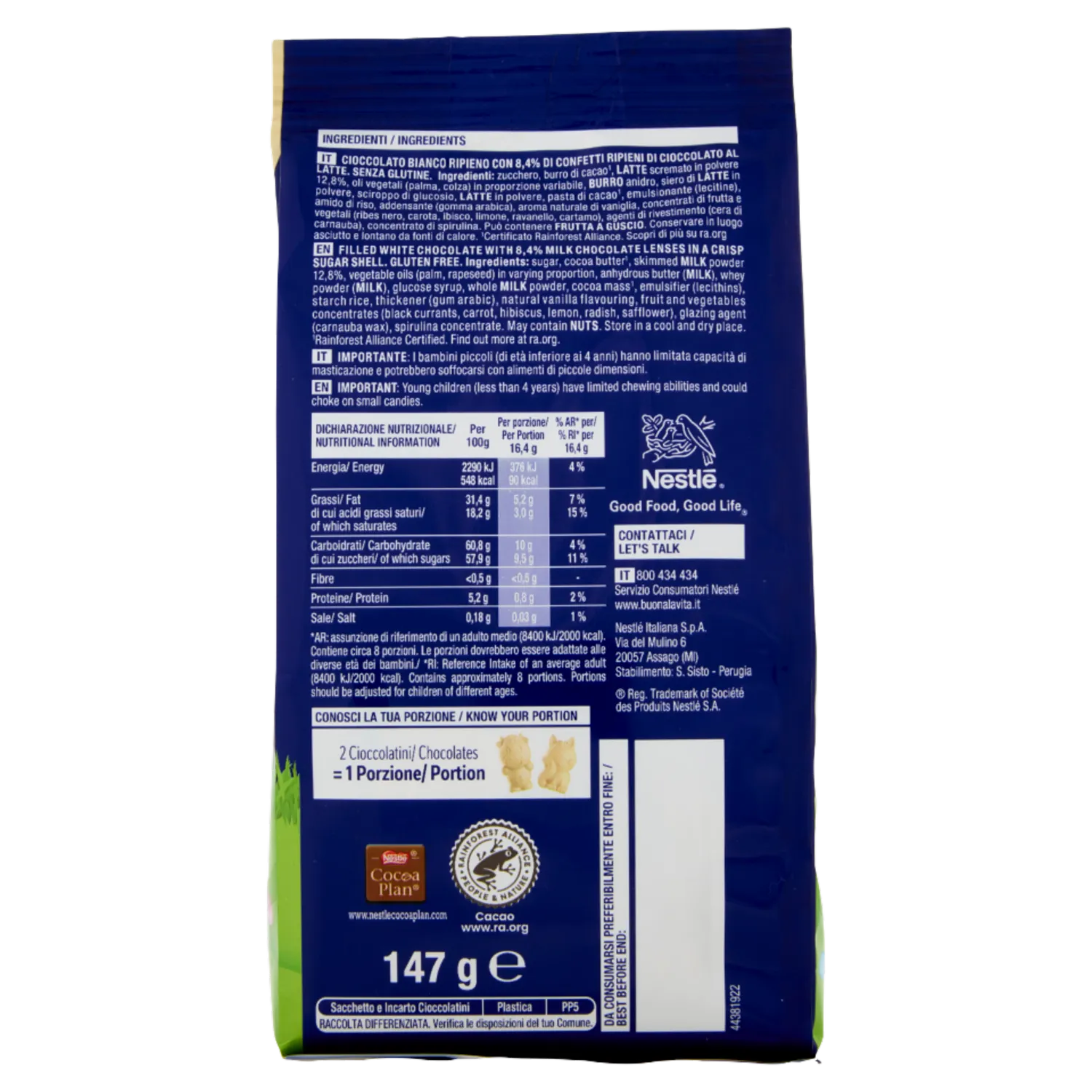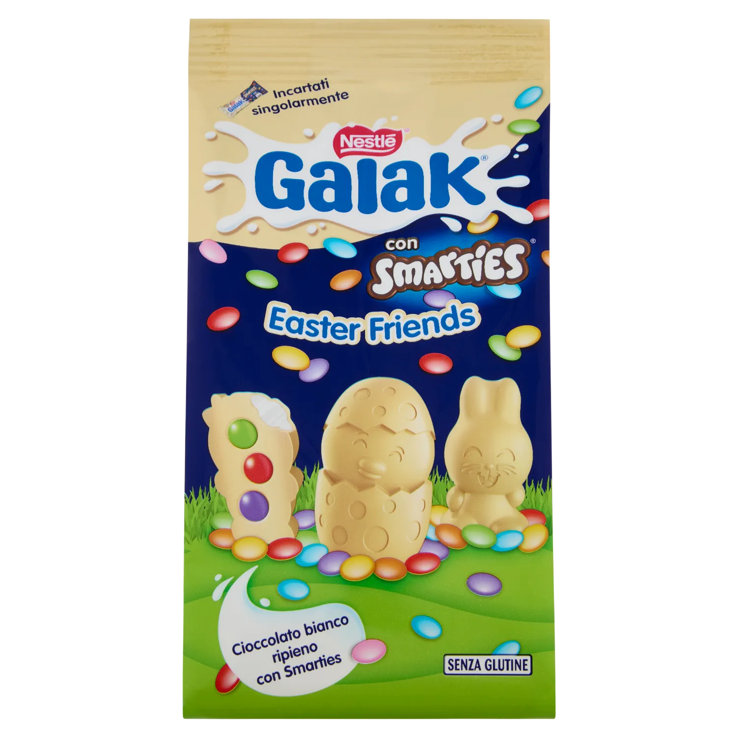 Galak Smarties Easter Friends è uno snack pasquale da 147g composto da delizioso cioccolato bianco Galak con all’interno colorati confetti Smarties ripieni di cioccolato al latte. Le simpatiche forme pasquali come coniglietti e pulcini rendono questo dolce perfetto per bambini e adulti, ideale per cesti di Pasqua, regali o momenti di dolcezza in famiglia. Un mix irresistibile tra cremosità e croccantezza che unisce qualità Nestlé e divertimento.